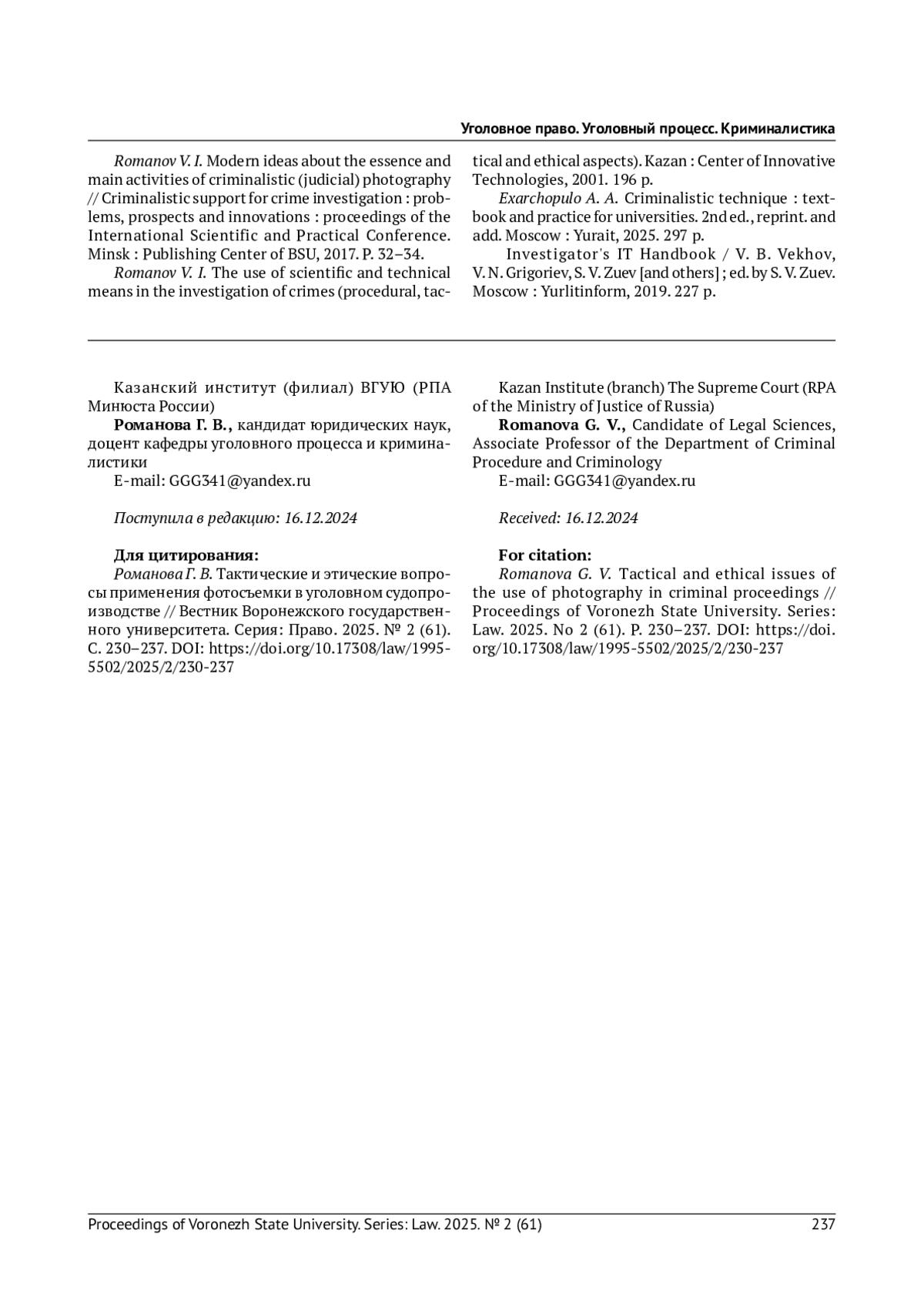 5. Романов В. И. Современные представления о сущности и основных направлениях деятельности криминалистической (судебной) фотографии // Криминалистическое обеспечение расследования преступлений: проблемы, перспективы и инновации: материалы Междунар. науч.-практ. конф. Минск: Издат. центр БГУ, 2017. С. 32-34. EDN: URVEJT