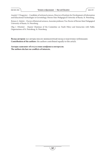 19. Тарасов С. В., Бордовский Г. А., Финагентов А. В. Создание института развития информационных и образовательных технологий в области геронтологии в структуре РГПУ им. А. И. Герцена и формирование системы комплексной медико-социальной помощи гражданам старшего поколения в Санкт-Петербурге // Успехи геронтологии. 2023. Т. 36. № 3. С. 435-436.