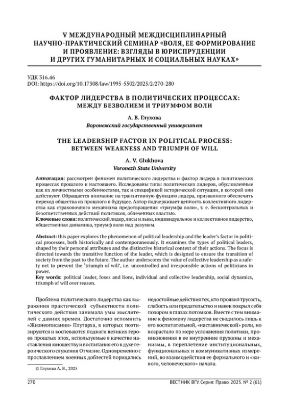Рассмотрен феномен политического лидерства и фактор лидера в политических процессах прошлого и настоящего. Исследованы типы политических лидеров, обусловленные как их личностными особенностями, так и спецификой исторической ситуации, в которой они действуют. Обращается внимание на транзитивную функцию лидера, призванного обеспечить переход общества из прошлого в будущее. Автор подчеркивает ценность коллективного лидерства как страховочного механизма предотвращения «триумфа воли», т. е. бесконтрольных и безответственных действий политиков, облеченных властью.