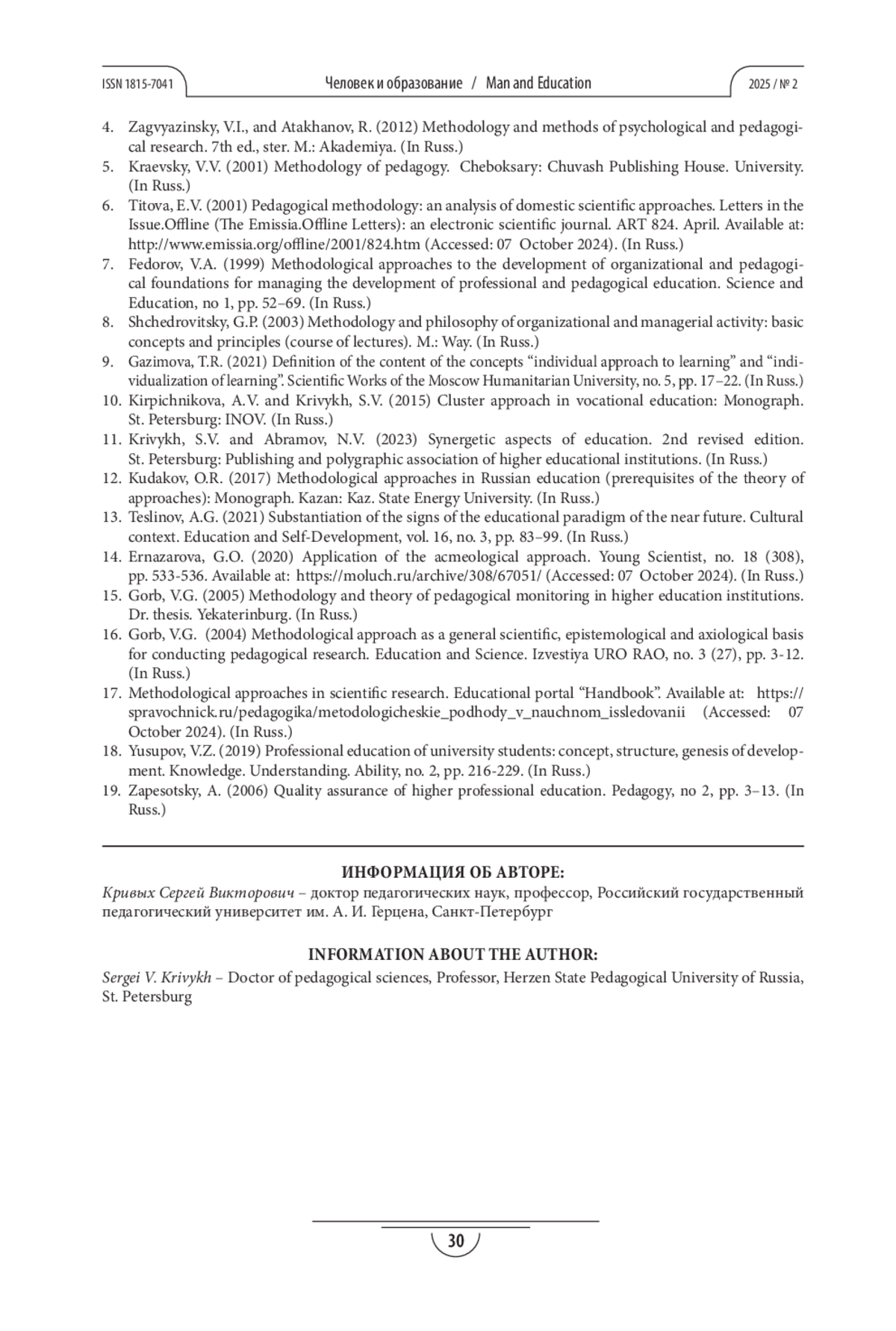 6. Титова Е.В. Педагогическая методология: анализ отечественных научных подходов // Письма в Эмиссия.Оффлайн (The Emissia.Offline Letters): электронный научный журнал. ART 824. 2001. Апрель. URL: http://www.emissia.org/offline/2001/824.htm