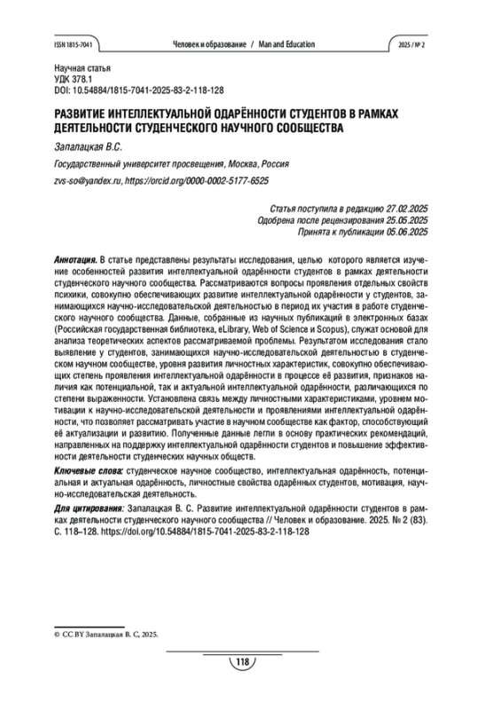 В статье представлены результаты исследования, целью которого является изучение особенностей развития интеллектуальной одарённости студентов в рамках деятельности студенческого научного сообщества. Рассматриваются вопросы проявления отдельных свойств психики, совокупно обеспечивающих развитие интеллектуальной одарённости у студентов, занимающихся научно-исследовательской деятельностью в период их участия в работе студенческого научного сообщества. Данные, собранные из научных публикаций в электронных базах (Российская государственная библиотека, eLibrary, Web of Science и Scopus), служат основой для анализа теоретических аспектов рассматриваемой проблемы. Результатом исследования стало выявление у студентов, занимающихся научно-исследовательской деятельностью в студенческом научном сообществе, уровня развития личностных характеристик, совокупно обеспечивающих степень проявления интеллектуальной одарённости в процессе её развития, признаков наличия как потенциальной, так и актуальной интеллектуальной одарённости, различающихся по степени выраженности. Установлена связь между личностными характеристиками, уровнем мотивации к научно-исследовательской деятельности и проявлениями интеллектуальной одарённости, что позволяет рассматривать участие в научном сообществе как фактор, способствующий её актуализации и развитию. Полученные данные легли в основу практических рекомендаций, направленных на поддержку интеллектуальной одарённости студентов и повышение эффективности деятельности студенческих научных обществ.