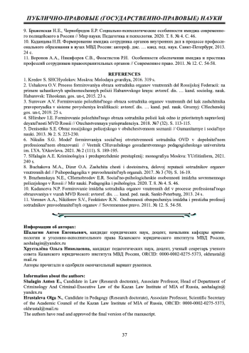 9. Браженская Н.Е., Чернобродов Е.Р. Социально-психологические особенности имиджа современного полицейского в России // Мир науки. Педагогика и психология. 2020. Т. 8. № 4. С. 46. EDN: OZMAOP