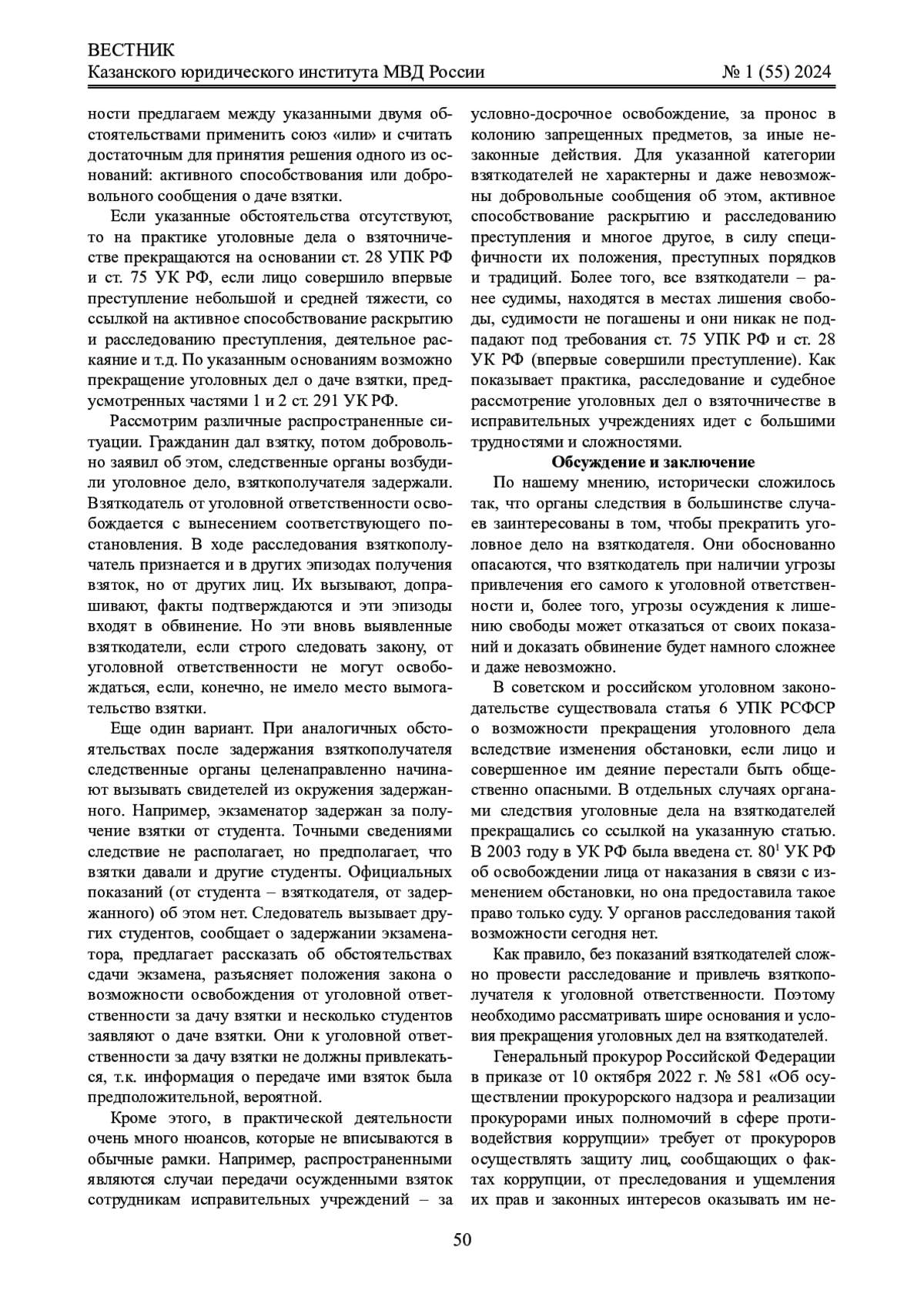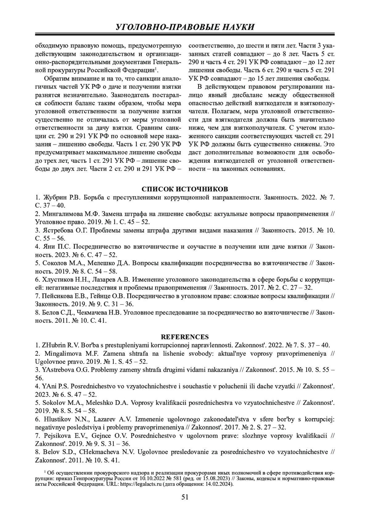 8. Белов С.Д., Чекмачева Н.В. Уголовное преследование за посредничество во взяточничестве // Законность. 2011. № 10. С. 41. EDN: OIGQTB