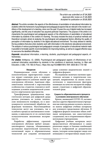 За последние 10 лет использование цифровых медиа значительно возросло и данное направление в обучении приобрело особую значимость. В статье рассмотрены аспекты эффективности усвоения учебной информации студентами в рамках психолого-педагогических аспектов, актуальных в современных условиях развития электронного обучения. Цель статьи – охарактеризовать психолого-педагогические аспекты эффективности усвоения учебной информации студентами в условиях электронного обучения. Исследование включило изучение практических методик и теоретических концепций, направленных на анализ психологических и педагогических факторов, влияющих на качество восприятия информации студентами в цифровой образовательной среде. Исследование позволило выявить ключевые проблемы, возникающие при работе студентов с информацией в электронной образовательной среде. Анализ различных психолого-педагогических концепций восприятия учебного материала дал возможность сформулировать конкретные рекомендации по совершенствованию обучения, а также предложить эффективные пути преодоления обнаруженных трудностей.