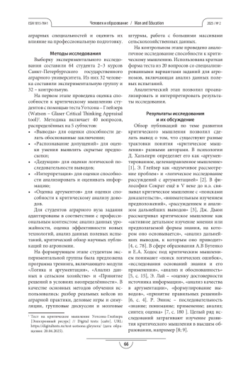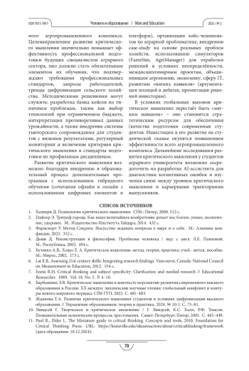 В статье рассматриваются актуальные методы развития критического мышления у студентов аграрных вузов в условиях цифровизации и глобализации сельского хозяйства. Обосновывается положение о том, что в условиях глобальных вызовов критическое мышление перестаёт быть «мягким навыком», а становится стратегическим ресурсом для обеспечения качества подготовки студентов. Анализируются педагогические технологии развития критического мышления, такие как кейс-стади, дебаты, проектное обучение и цифровые инструменты, способствующие формированию аналитических навыков, необходимых для решения сложных агропромышленных задач. Приводятся результаты экспериментального исследования, проведённого среди студентов Санкт-Петербургского государственного аграрного университета, а также рекомендации по интеграции критического мышления в образовательные программы.