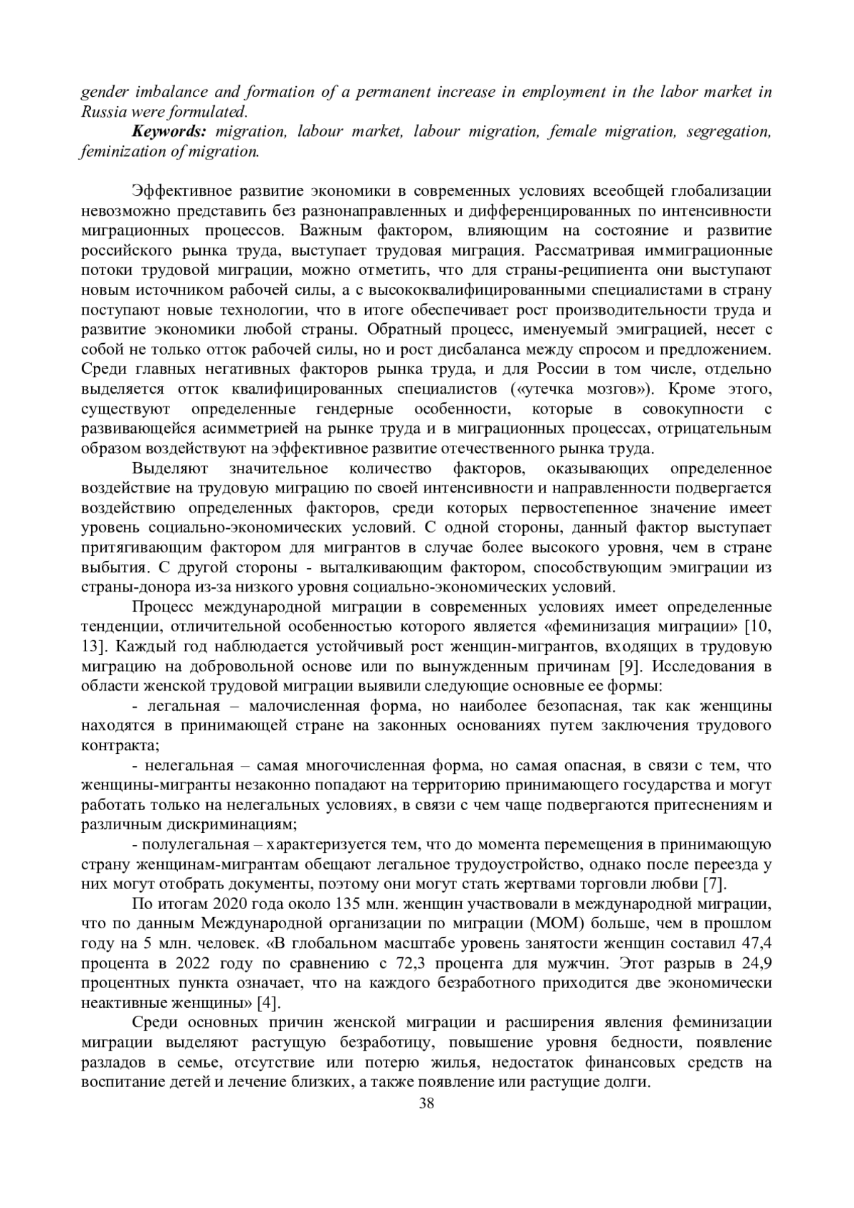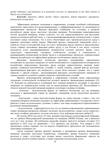 В современных условиях развитие экономики любой страны в значительной степени зависит от эффективности рынка труда, что определяется его структурой, высокой степенью адаптации к экономическим тенденциям, развитой законодательной базой, а также статистическими изменениями в трудовой миграции. В статье изучаются теоретические основы в области миграционных процессов, рассматриваются и характеризуются различные виды «гендерной сегрегации», кроме этого, особое внимание уделяется гендерной специфике в миграционных процессах, оказывающих определенное воздействие на рынок труда. Проведенный статистический анализ определил реальное состояние рынка труда в России, учитывающий особенности гендерных аспектов. В процессе работы были выявлены тенденции, оказывающие негативное воздействие на существующую трудовую миграцию среди женщин, а также выделены ключевые барьеры, ограничивающие доступ на отечественный рынок труда женщин трудовых иммигрантов. На основе проведенного исследования были сформулированы конкретные меры, направленные на снижение уровня гендерного дисбаланса и формирование постоянного увеличения занятости на рынке труда в России.