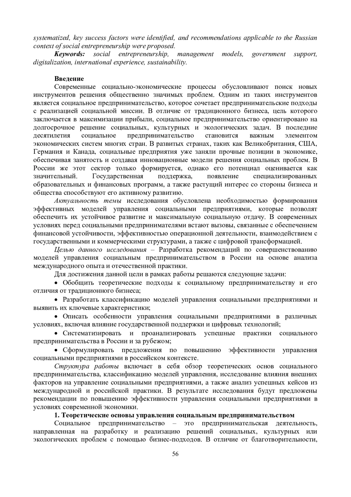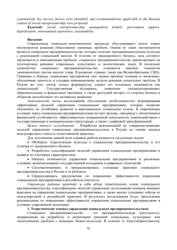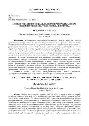 Современные социально-экономические реалии требуют поиска эффективных инструментов для решения общественно значимых проблем. Одним из таких инструментов выступает социальное предпринимательство, сочетающее бизнес-методы с реализацией социальной миссии. Актуальность исследования обусловлена необходимостью выработки действенных моделей управления социальными предприятиями, способствующих их устойчивому функционированию и масштабированию. Целью настоящего исследования является формулирование практических рекомендаций по совершенствованию управления социальными предприятиями на основе анализа международного опыта и российской практики. В рамках поставленной цели решались следующие задачи: классификация существующих моделей управления социальным предпринимательством, оценка влияния государственной поддержки и цифровизации, а также анализ успешных кейсов из разных стран. Методологическую основу исследования составили сравнительный анализ, кейс-стади и элементы системного подхода. В результате исследования обобщены модели управления, выявлены ключевые факторы эффективности и предложены рекомендации, применимые в российском контексте социального предпринимательства.