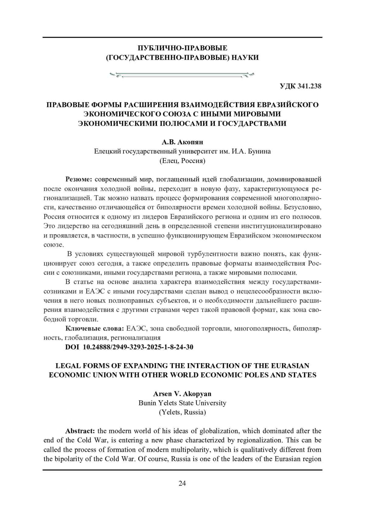 Современный мир, поглащенный идей глобализации, доминировавшей после окончания холодной войны, переходит в новую фазу, характеризующуюся регионализацией. Так можно назвать процесс формирования современной многополярности, качественно отличающейся от биполярности времен холодной войны. Безусловно, Россия относится к одному из лидеров Евразийского региона и одним из его полюсов. Это лидерство на сегодняшний день в определенной степени институционализировано и проявляется, в частности, в успешно функционирующем Евразийском экономическом союзе. В условиях существующей мировой турбулентности важно понять, как функционирует союз сегодня, а также определить правовые форматы взаимодействия России с союзниками, иными государствами региона, а также мировыми полюсами. В статье на основе анализа характера взаимодействия между государствами-созниками и ЕАЭС с иными государствами сделан вывод о нецелесообразности включения в него новых полноправных субъектов, и о необходимости дальнейшего расширения взаимодействия с другими странами через такой правовой формат, как зона свободной торговли.