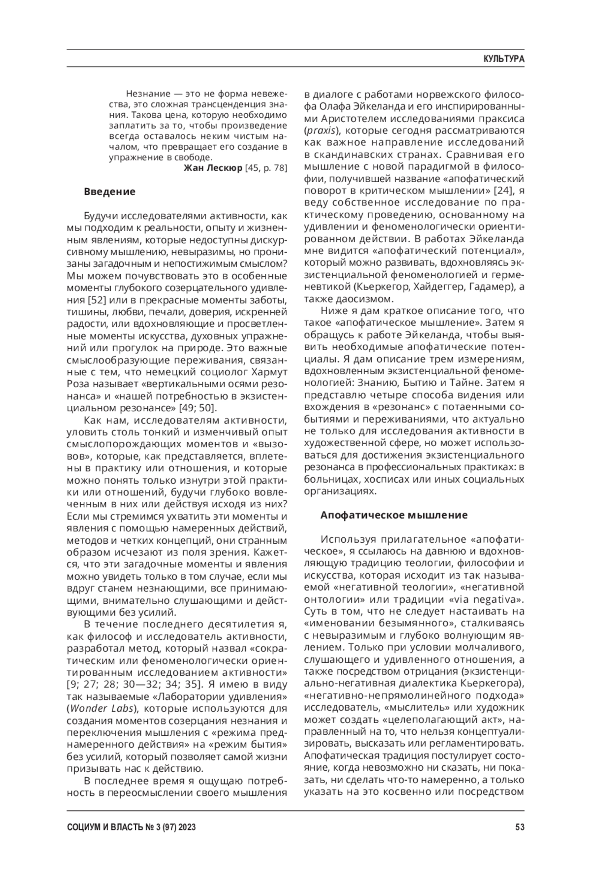 Будучи исследователями активности, как мы подходим к реальности, опыту и жизненным явлениям, которые недоступны дискурсивному мышлению, невыразимы, но пронизаны загадочным и непостижимым смыслом? Мы можем почувствовать это в особенные моменты глубокого созерцательного удивления [52] или в прекрасные моменты заботы, тишины, любви, печали, доверия, искренней радости, или вдохновляющие и просветленные моменты искусства, духовных упражнений или прогулок на природе. Это важные смыслообразующие переживания, связанные с тем, что немецкий социолог Хармут Роза называет «вертикальными осями резонанса» и «нашей потребностью в экзистенциальном резонансе» [49; 50].