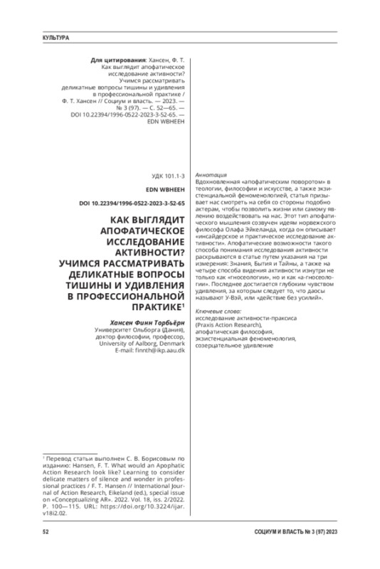 Вдохновленная «апофатическим поворотом» в теологии, философии и искусстве, а также экзистенциальной феноменологией, статья призывает нас смотреть на себя со стороны подобно актерам, чтобы позволить жизни или самому явлению воздействовать на нас. Этот тип апофатического мышления созвучен идеям норвежского философа Олафа Эйкеланда, когда он описывает «инсайдерское и практическое исследование активности». Апофатические возможности такого способа понимания исследования активности раскрываются в статье путем указания на три измерения: Знания, Бытия и Тайны, а также на четыре способа видения активности изнутри не только как «гносеологии», но и как «а-гносеологии». Последнее достигается глубоким чувством удивления, за которым следует то, что даосы называют У-Вэй, или «действие без усилий».