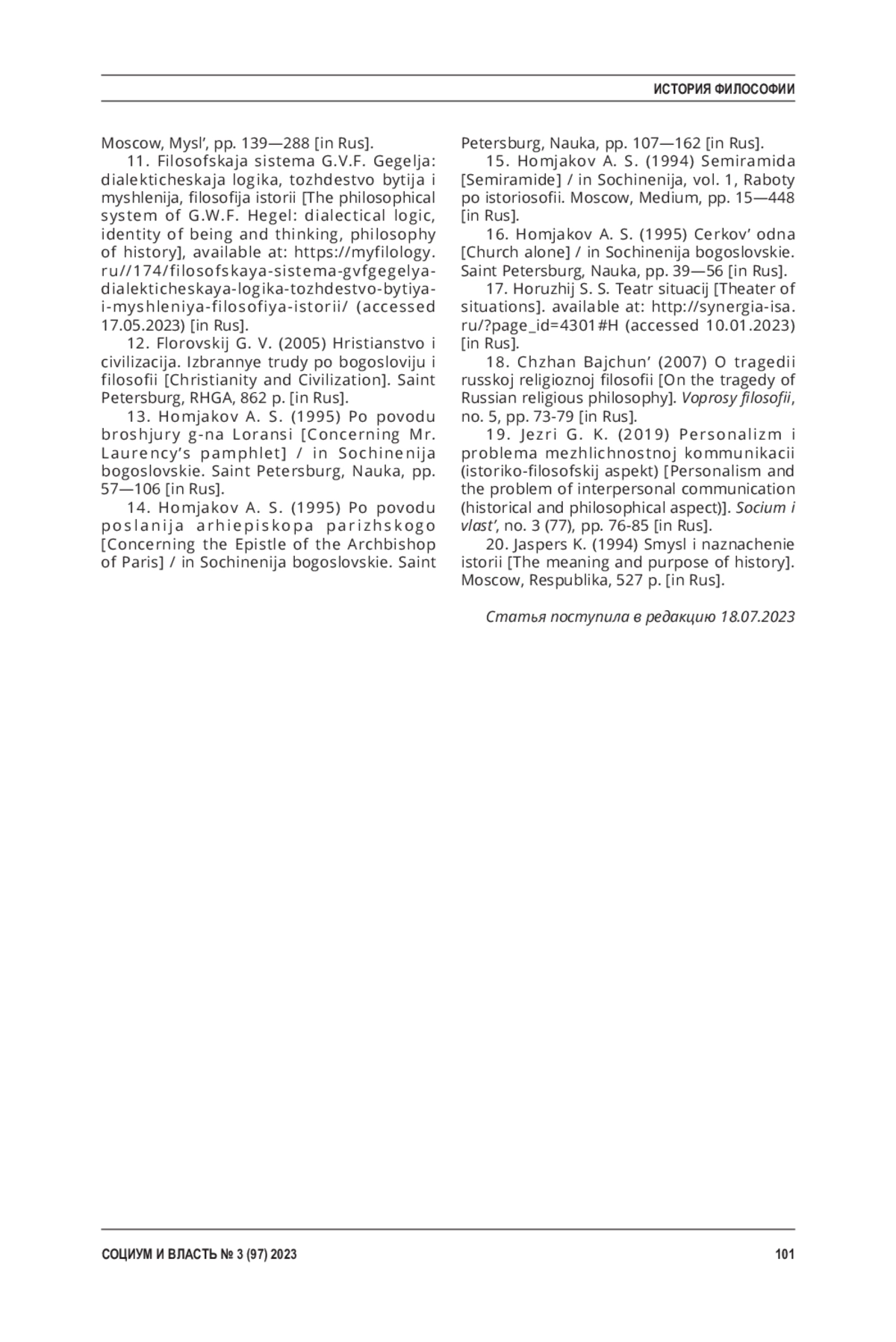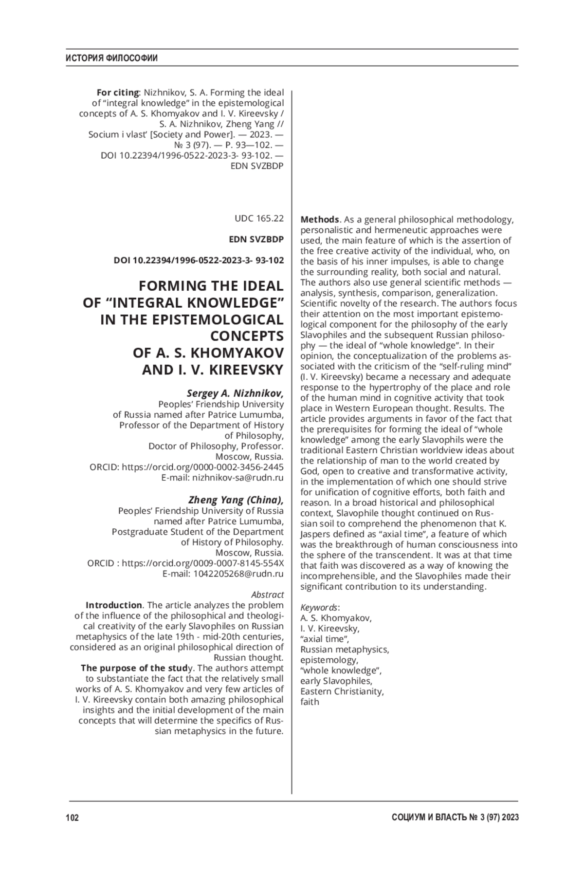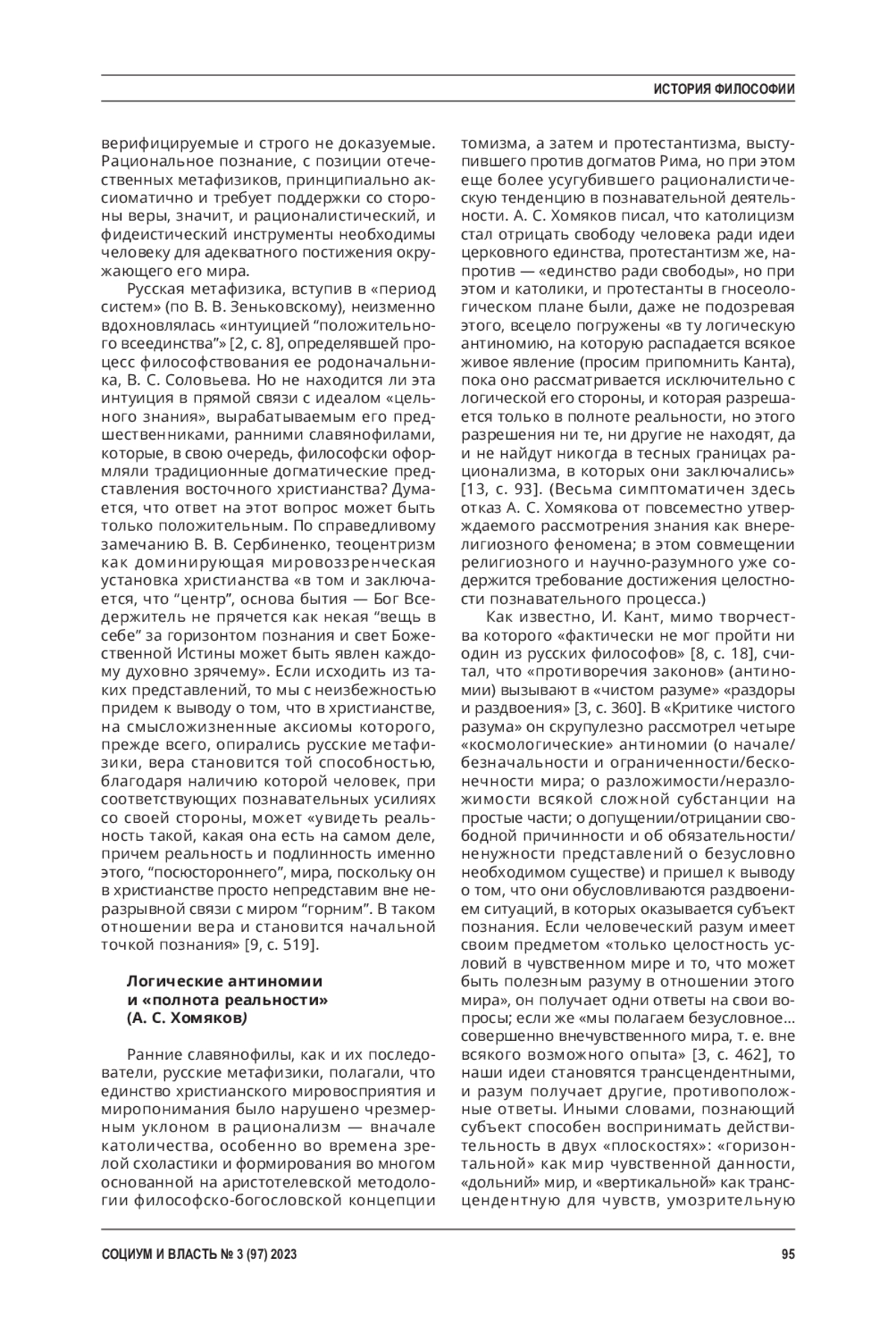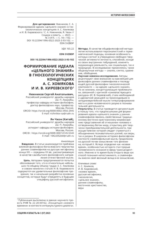НИЖНИКОВ С. А., ЧЖЭН Я. ФОРМИРОВАНИЕ ИДЕАЛА "ЦЕЛЬНОГО ЗНАНИЯ" В ГНОСЕОЛОГИЧЕСКИХ КОНЦЕПЦИЯХ А. С. ХОМЯКОВА И И. В. КИРЕЕВСКОГО // СОЦИУМ И ВЛАСТЬ. 2023. № 3 (97)
