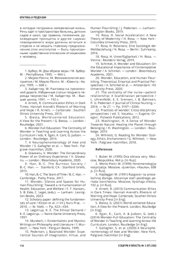 Статья: ФИЛОСОФСКОЕ СОЗЕРЦАНИЕ ДЛЯ ПОМОГАЮЩИХ ПРАКТИК (РЕЦЕНЗИЯ НА КНИГУ: WONDER, SILENCE AND SPACES FOR HUMAN FLOURISHING: TOWARD A RE-HUMANIZATION OF HEALTH, EDUCATION, AND WELFARE / ED. BY F. T. HANSEN, S. B. EIDE, & C. LEGET. LANHAM, MARYLAND (US ): LEXINGTON BOOKS, 2023. 224 P.) (2023)