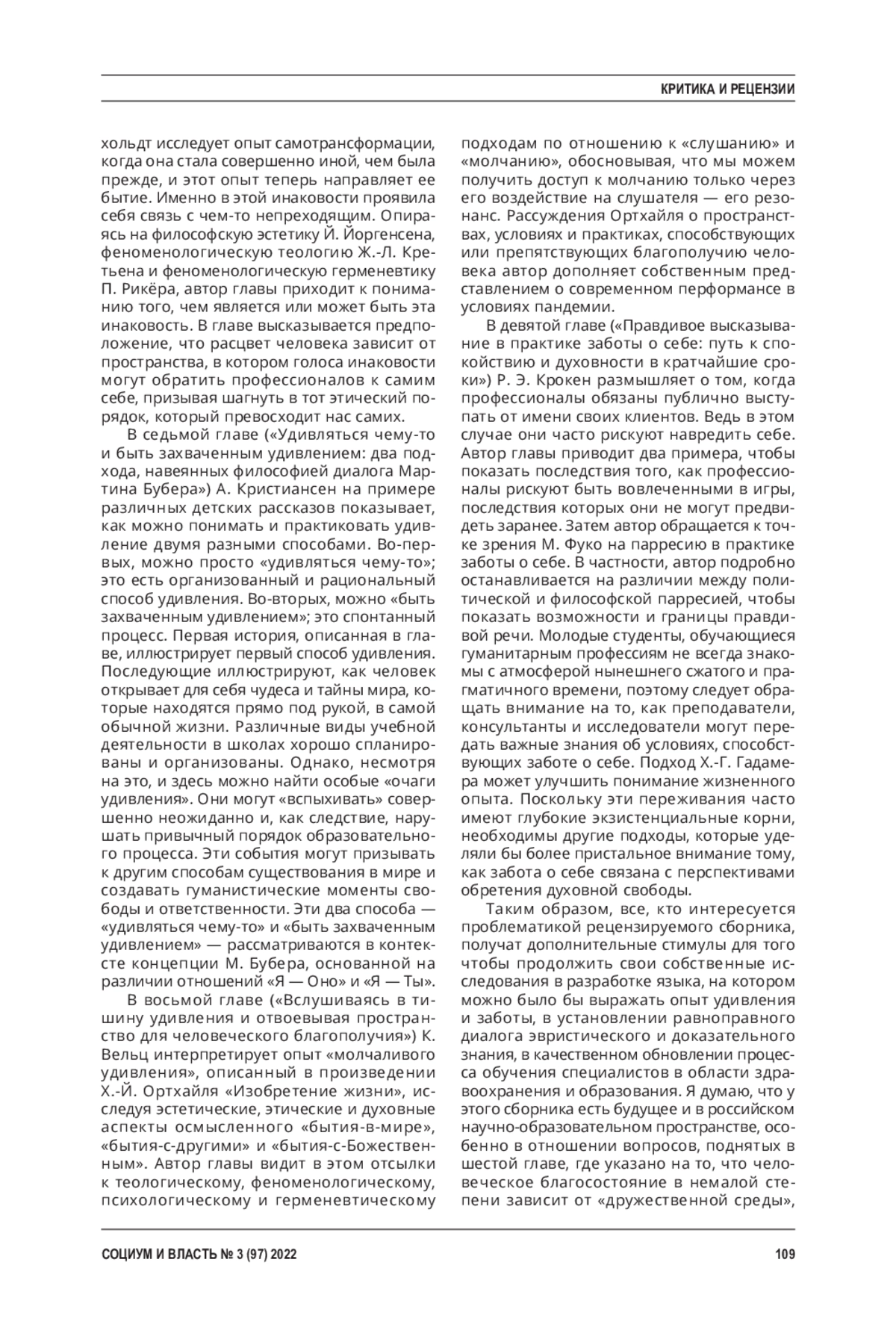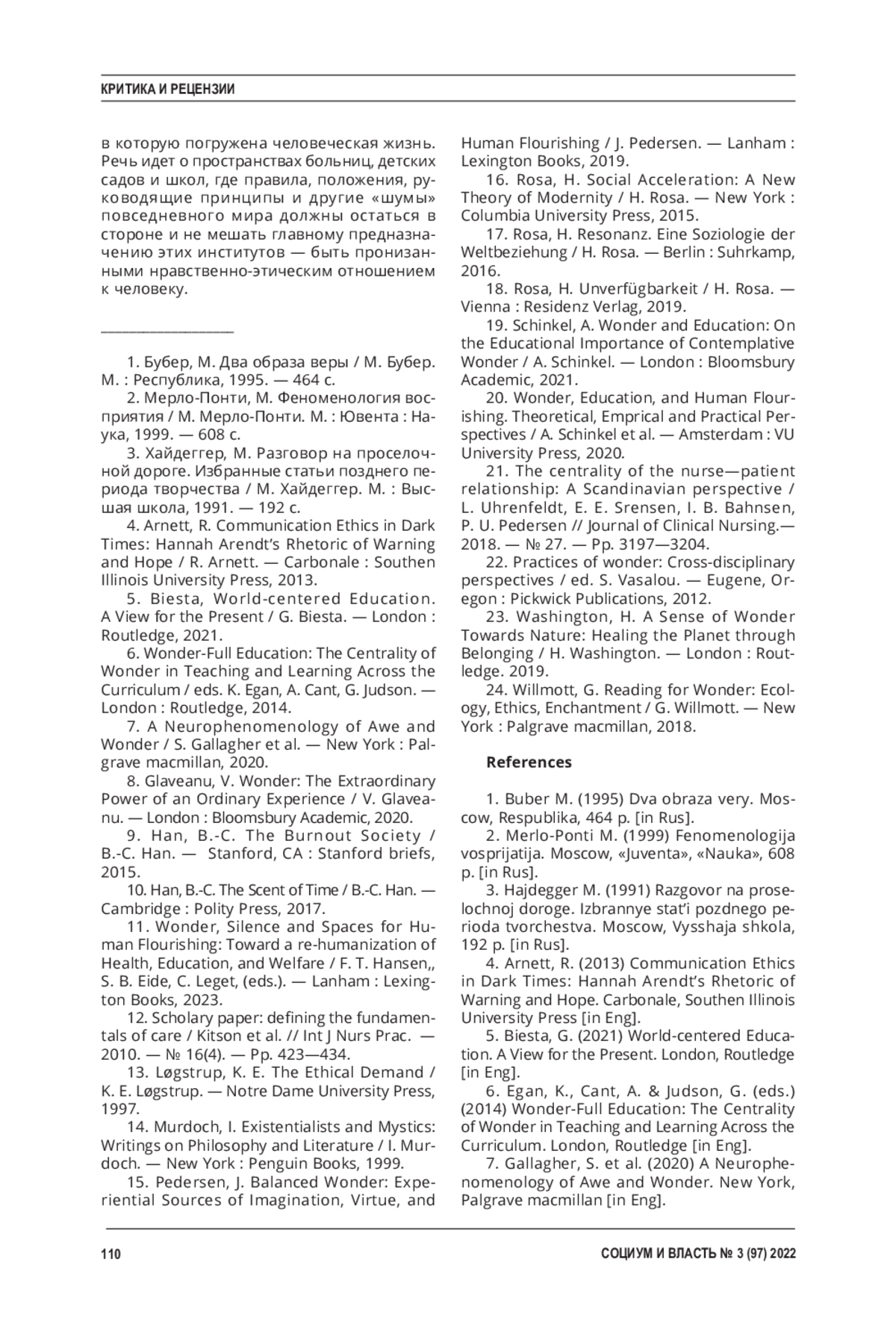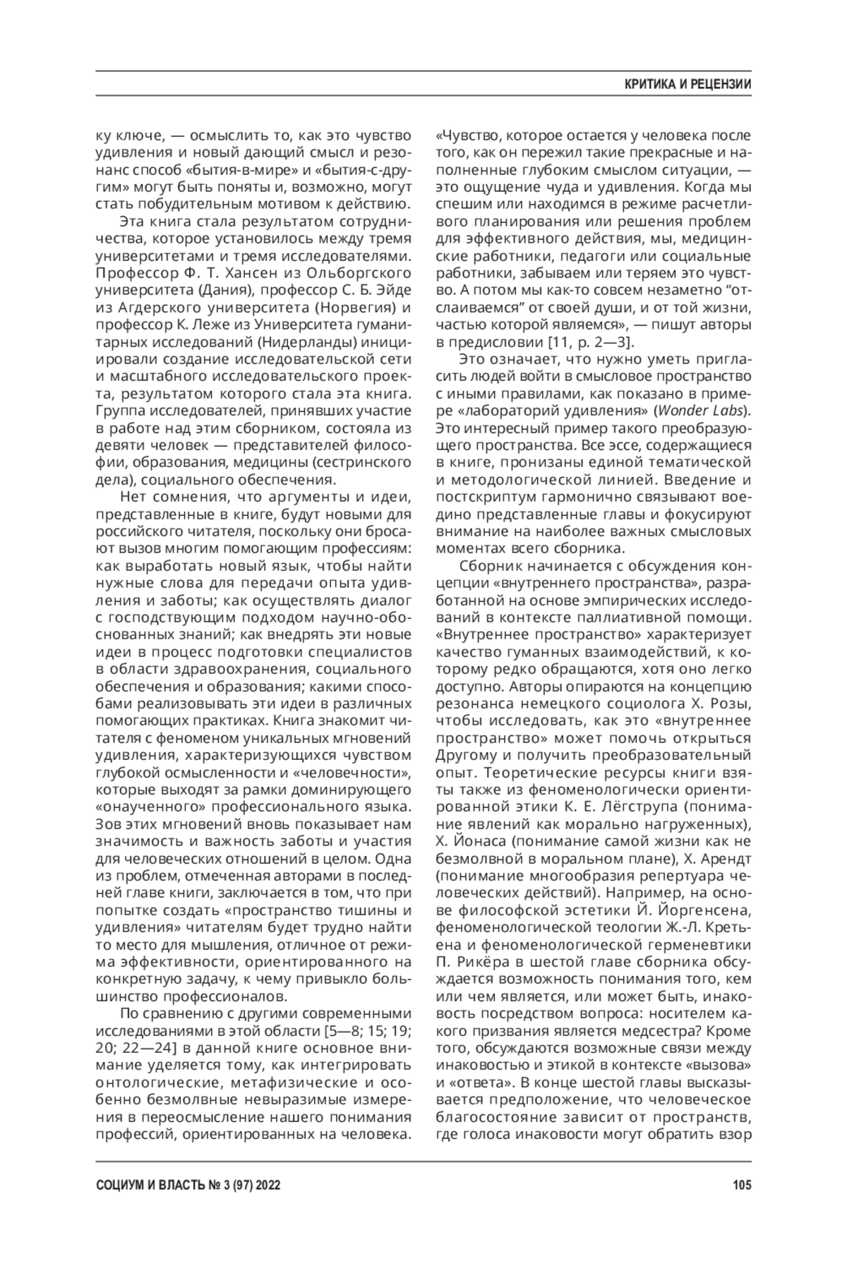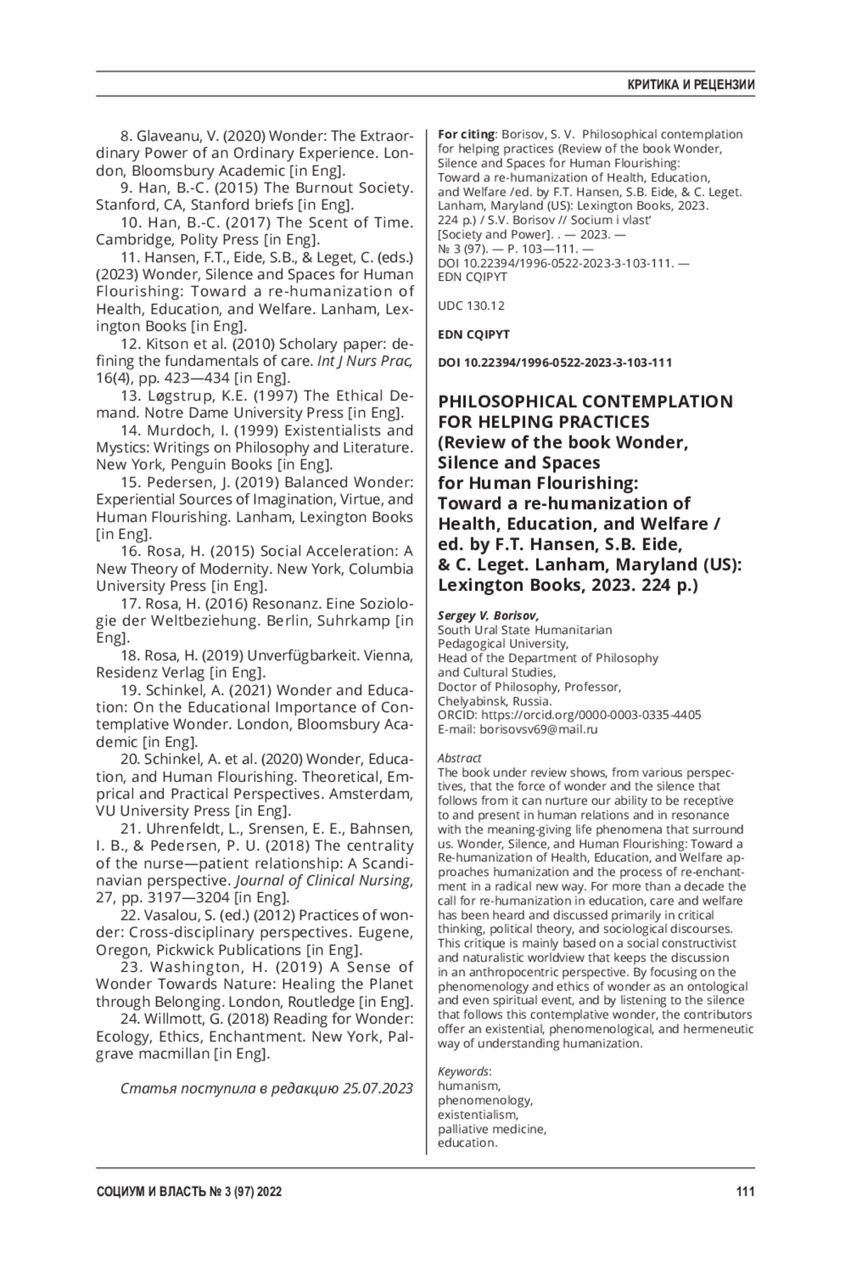 БОРИСОВ С. В. ФИЛОСОФСКОЕ СОЗЕРЦАНИЕ ДЛЯ ПОМОГАЮЩИХ ПРАКТИК (РЕЦЕНЗИЯ НА КНИГУ: WONDER, SILENCE AND SPACES FOR HUMAN FLOURISHING: TOWARD A RE-HUMANIZATION OF HEALTH, EDUCATION, AND WELFARE / ED. BY F. T. HANSEN, S. B. EIDE, & C. LEGET. LANHAM, MARYLAND (US ): LEXINGTON BOOKS, 2023. 224 P.) // СОЦИУМ И ВЛАСТЬ. 2023. № 3 (97)