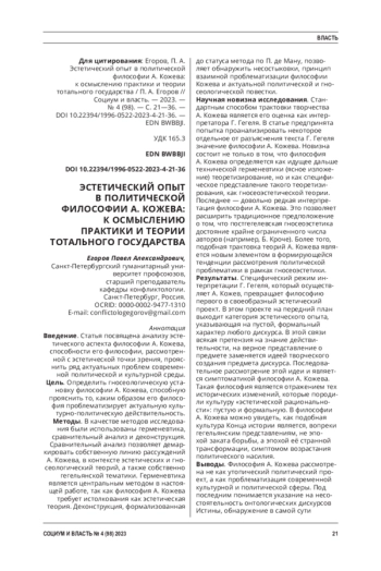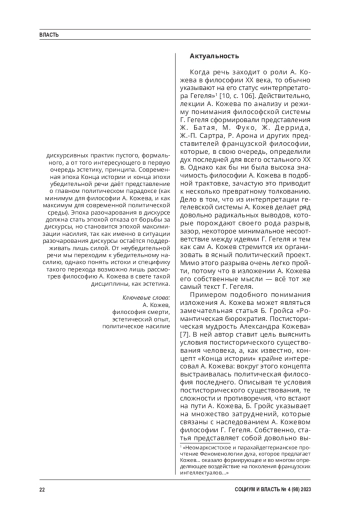 Методы. В качестве методов исследования были использованы герменевтика, сравнительный анализ и деконструкция. Сравнительный анализ позволяет демаркировать собственную линию рассуждений А. Кожева, в контексте эстетических и гносеологический теорий, а также собственно гегельянской тематики. Герменевтика является центральным методом в настоящей работе, так как философия А. Кожева требует истолкования как эстетическая теория. Деконструкция, формализованная до статуса метода по П. де Ману, позволяет обнаружить несостыковки, принцип взаимной проблематизации философии Кожева и актуальной политической и гносеологической повестки. Научная новизна исследования. Стандартным способом трактовки творчества А. Кожева является его оценка как интерпретатора Г. Гегеля. В статье предпринята попытка проанализировать некоторое отдельное от разъяснения текста Г. Гегеля значение философии А. Кожева. Новизна состоит не только в том, что философия А. Кожева определяется как идущее дальше технической герменевтики (ясное изложение) теоретизирование, но и как специфическое представление такого теоретизирования, как гносеоэстетической теории. Последнее - довольно редкая интерпретация философии А. Кожева. Это позволяет расширить традиционное предположение о том, что постгегелевская гносеоэстетика достояние крайне ограниченного числа авторов (например, Б. Кроче). Более того, подобная трактовка теорий А. Кожева является новым элементом в формирующейся тенденции рассмотрения политической проблематики в рамках гносеоэстетики.