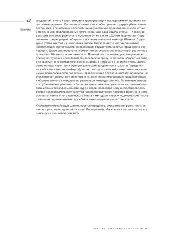 Статья посвящена исследованию «субъективной реальности» участников крестьяноведческих проектов Теодора Шанина. Несмотря на значительное внимание к методологическим, эпистемологическим и эмпирическим аспектам исследований, личный опыт, эмоции и трансформации исследователей остаются недостаточно изучены. Статья восполняет этот пробел, реконструируя субъективные восприятия, впечатления и воспоминания участников проектов на основе устных историй и уже опубликованных источников. Еще одна задача статьи - локализовать субъективную реальность посредством ее связи с Домом творчества «Переделкино», где регулярно собиралась исследовательская команда Шанина. Структурно статья состоит из нескольких частей. Вначале автор кратко описывает констелляцию обстоятельств, позволивших осуществить крестьяноведческие экспедиции. Далее анализируется «субъективная реальность знакомства» участников проектов с Шаниным и его замыслом. Полевой этап проектов рассмотрен через призму погружения исследователей в сельскую среду, их попытки заручиться доверие крестьян и те методологические вызовы, с которыми они столкнулись. Затем автор изучает структуру и функции дискуссий за «длинным столом» в Переделкине и обосновывает их двойную функцию: методологической синхронизации и взаимной психологической поддержки. В завершение показана институционализация субъективной реальности проектов и их влияние на последующие академические и образовательные инициативы участников команды Шанина. По мнению автора, эта субъективная реальность была связана с интеллектуальными и социально-политическими трансформациями 1990-х годов, благодаря чему и сформировалась особая исследовательская культура крестьяноведческих проектов Шанина, в которой осмысление этнографического опыта и методологических подходов сочеталось с личными переживаниями, дружбой и интеллектуальным партнерством.