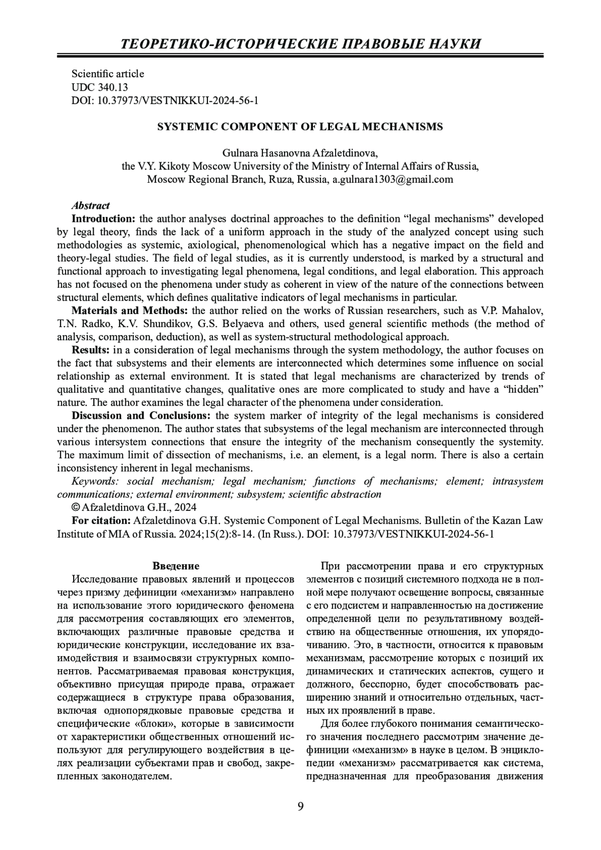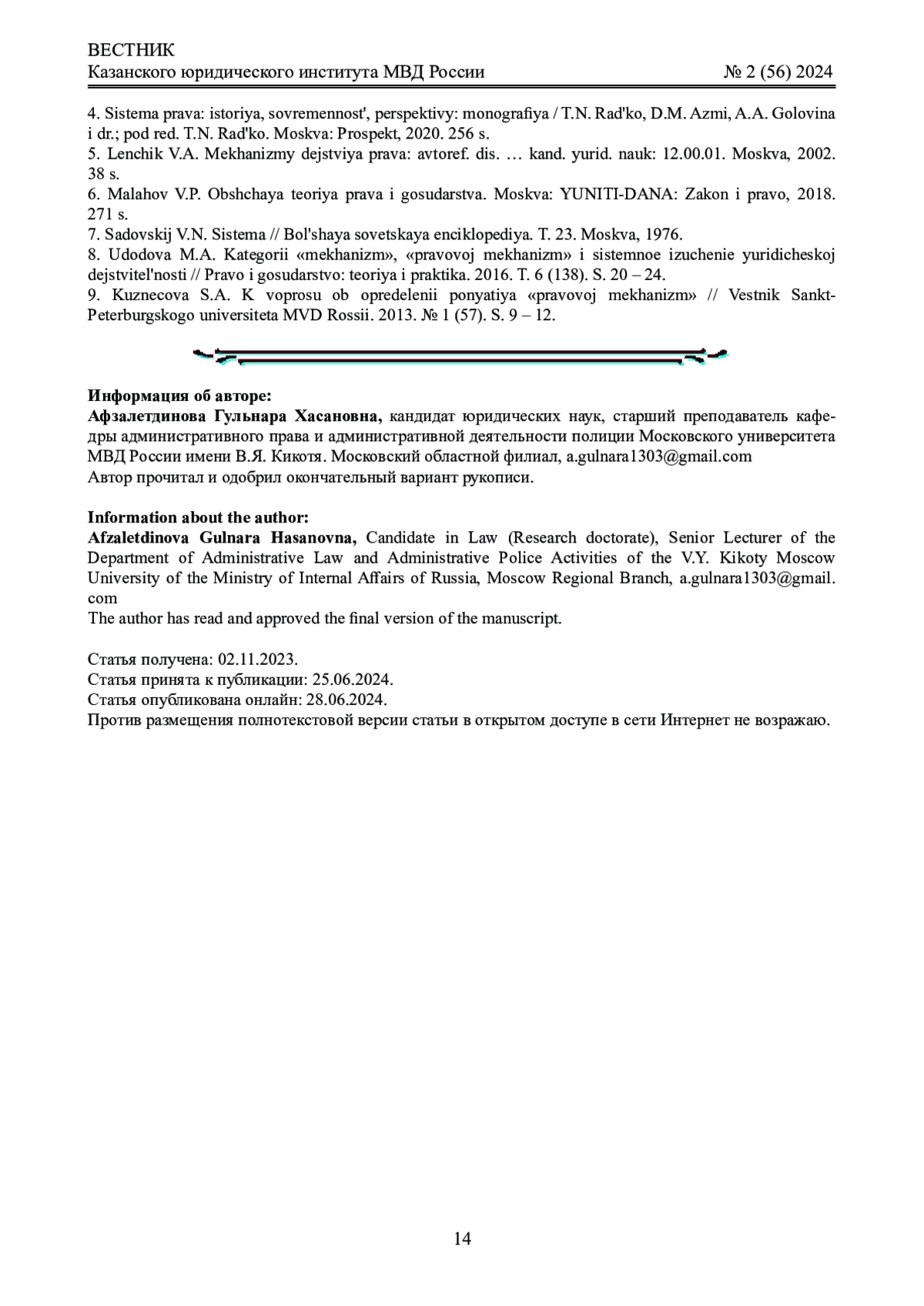 9. Кузнецова С.А. К вопросу об определении понятия “правовой механизм” // Вестник Санкт-Петербургского университета МВД России. 2013. № 1 (57). С. 9 - 12. EDN: QBBDUN
