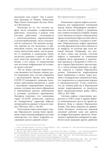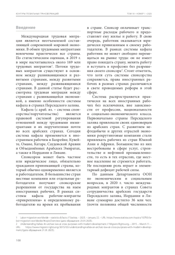 В статье рассматривается система кафала - правовая система регулирования трудовых отношений между работодателями и рабочими-мигрантами в арабских странах Персидского залива. Особое внимание уделяется условиям труда мигрантов в рамках данной системы, правам иностранных работников, отношению к «гастарбайтерам» со стороны работодателей, а также реформированию системы. Приведена краткая история возникновения системы спонсорства и ее развития. Представлены мнения экспертов о будущем системы кафала, приведена позиция Международной организации труда (МОТ), Международной конфедерации профсоюзов (МКП) и правозащитных организаций. В заключении дано краткое сравнение системы кафала в Совете сотрудничества арабских государств Персидского залива (ССАГПЗ) и патентной системы в России. Несмотря на то, что международные организации выступают за упразднение системы кафала, препятствия для этого сохраняются. Проводимых реформ недостаточно, положение трудовых мигрантов, в особенности прислуги, остается тяжелым; всё также распространены случаи злоупотребления. Сделан вывод, что необходимо проведение дальнейших реформ и учреждение развернутого контрольного механизма за соблюдением новых законов в отношении иностранных рабочих. Также мигранты должны получать более весомую поддержку со стороны посольств и агентств по трудоустройству.