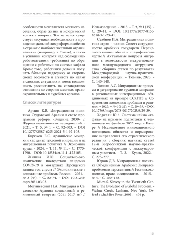5. Семёнов И.А. Миграционная поли-тика стран - членов Совета сотрудничества арабских государств Персидского залива: общие и специфические черты // Актуальные вопросы миграции и возможности межрегионального международного сотрудничества : сборник статей по результатам Международной научно-практической конференции. - Тюмень, 2023. - С. 140-148.