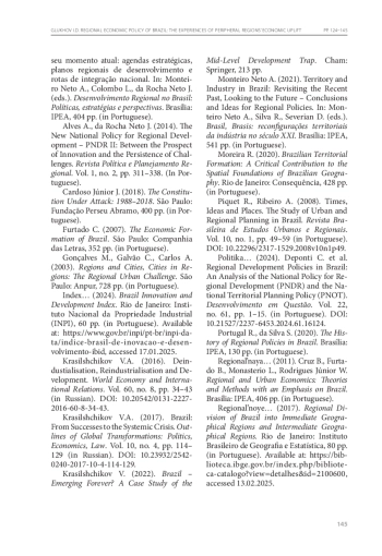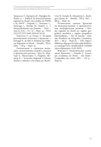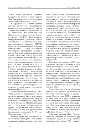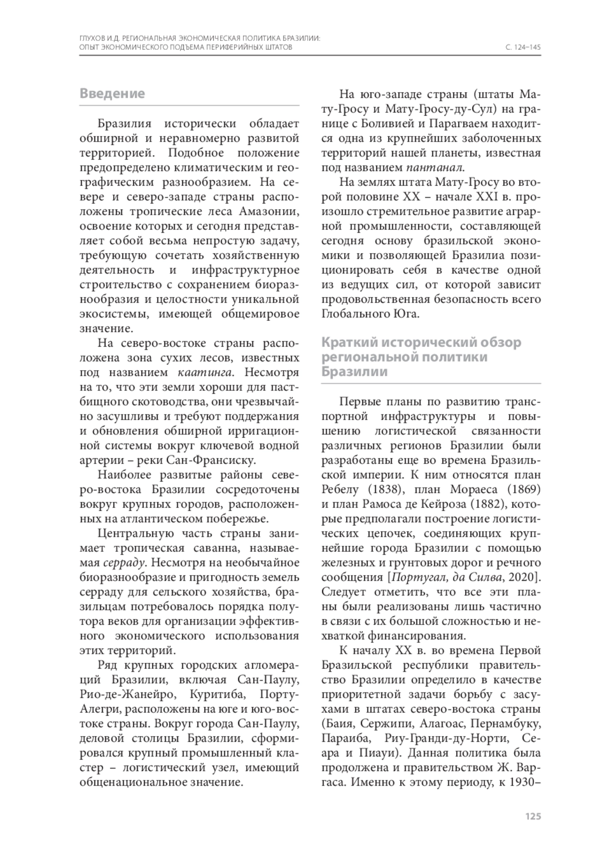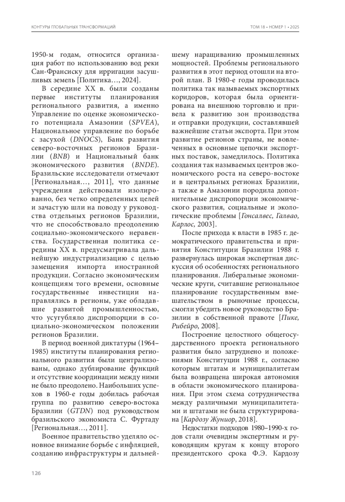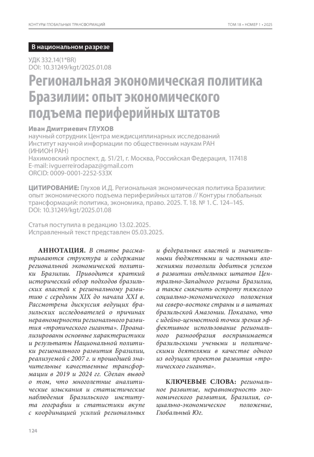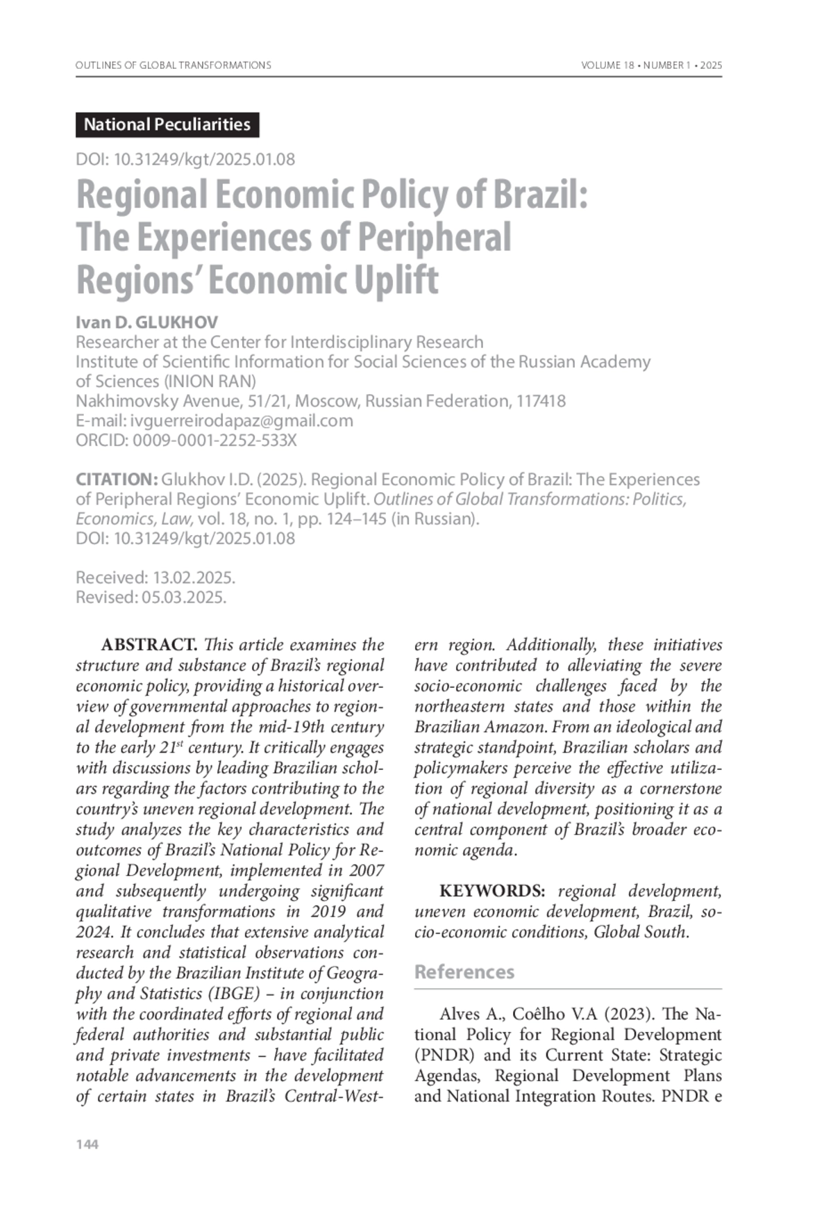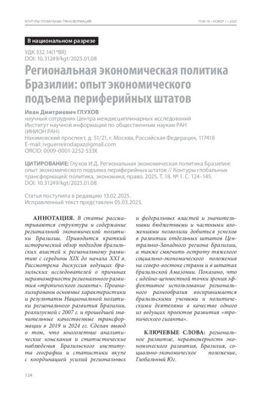ГЛУХОВ И. Д. РЕГИОНАЛЬНАЯ ЭКОНОМИЧЕСКАЯ ПОЛИТИКА БРАЗИЛИИ: ОПЫТ ЭКОНОМИЧЕСКОГО ПОДЪЕМА ПЕРИФЕРИЙНЫХ ШТАТОВ // КОНТУРЫ ГЛОБАЛЬНЫХ ТРАНСФОРМАЦИЙ: ПОЛИТИКА, ЭКОНОМИКА, ПРАВО. 2025. ТОМ 18, №1