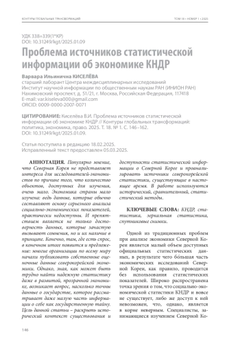 Популярно мнение, что Северная Корея не представляет интереса для исследователей-экономистов по причине того, что количество объектов, доступных для изучения, очень мало. Экономика страны мало изучена: ведь данные, которые обычно составляют основу серьезного анализа социально-экономических показателей, практически недоступны. И препятствием является не только достоверность данных, которые зачастую вызывают сомнения, но и их наличие в принципе. Конечно, там, где есть спрос, в конечном итоге появится и предложение: многие организации по всему миру начали публиковать собственные оценочные данные северокорейской экономики. Однако, зная, как может быть трудно найти надежную статистику даже в развитой, прозрачной экономике, возникает вопрос, насколько точны данные о государстве, которое рассматривает даже малую часть информации о себе как государственную тайну. Цель данной статьи - раскрыть исторический контекст существования и доступности статистической информации о Северной Корее и проанализировать источники северокорейской статистики, существующие в настоящее время. В работе используются исторический, сравнительный, статистический методы.
