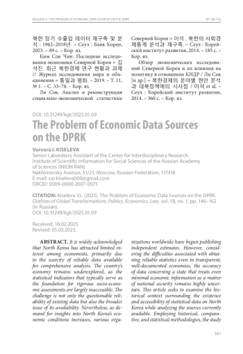9. Nam Sung Woo. A Study on the Evaluation of North Korean Statistical Services by Statistics Korea and Quality Improvement Directions // Journal of Peace and Unification. - 2023. - Vol. 13, N 1. - P. 35-61.