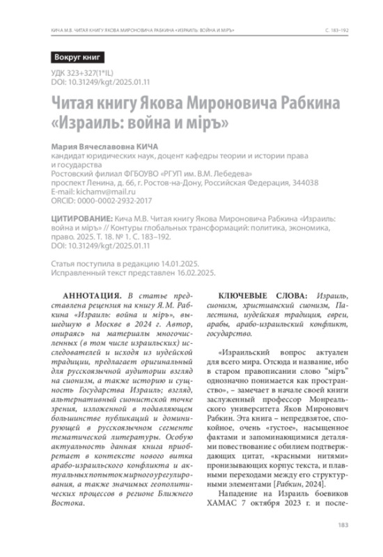 В статье представлена рецензия на книгу Я. М. Рабкина «Израиль: война и мiръ», вышедшую в Москве в 2024 г. Автор, опираясь на материалы многочисленных (в том числе израильских) исследователей и исходя из иудейской традиции, предлагает оригинальный для русскоязычной аудитории взгляд на сионизм, а также историю и сущность Государства Израиль; взгляд, альтернативный сионистской точке зрения, изложенной в подавляющем большинстве публикаций и доминирующей в русскоязычном сегменте тематической литературы. Особую актуальность данная книга приобретает в контексте нового витка арабо-израильского конфликта и актуальных попыток мирного урегулирования, а также значимых геополитических процессов в регионе Ближнего Востока.