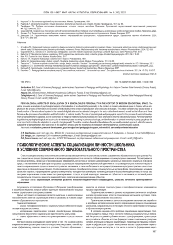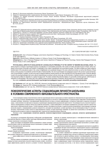 Статья посвящена анализу психологических аспектов социализации личности школьника в условиях современного образовательного пространства России с акцентом на процесс формирования и эволюции индивидуальности в контексте глобализационных и социокультурных изменений. Рассматриваются ключевые проблемы, связанные с трансформацией образовательной системы в условиях цифровизации и ускоренных изменений в социально-культурной среде, а также влияние этих факторов на процессы социализации и формирования национальной идентичности. Актуализируется роль психолого-педагогического сопровождения в процессе личностного развития школьников, а также необходимость интеграции традиционных культурных практик и ценностных ориентиров в образовательный процесс. Особое внимание уделено психофизиологическим и социокультурным метаморфозам, происходящим в младшем школьном возрасте, и формированию духовного иммунитета у молодежи как важнейшего условия адаптации к быстро меняющемуся миру. В статье рассмотрены теоретические основы личностно ориентированного подхода, который акцентирует внимание на субъектности школьников, их активной роли в познавательном процессе и важности взаимодействия с педагогом как коммуникативным субъектом.