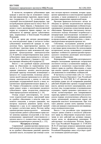 Материалы и методы: исследование конституционно-правовых и административно-процессуальных основ реализации субъективного права на судебное обжалование решений органов власти проводилось посредством использования основных методов научного познания: формально-логического, текстуального, системного и исторического методов, позволивших не только определить понятийно-категориальный аппарат, но и проанализировать законодательные нормы, опосредующие административно-процессуальный порядок осуществления рассматриваемого конституционного права.