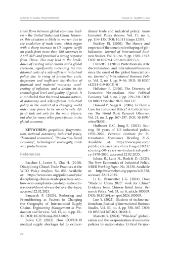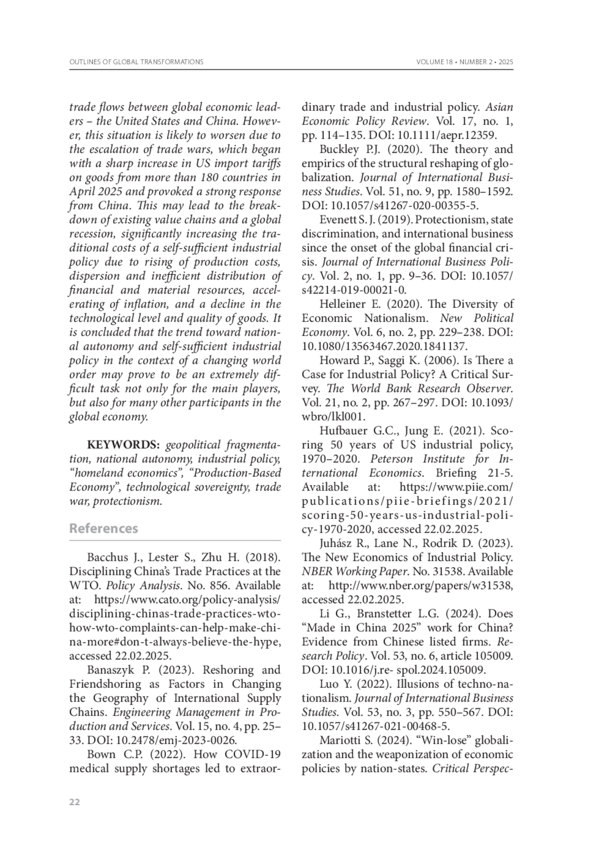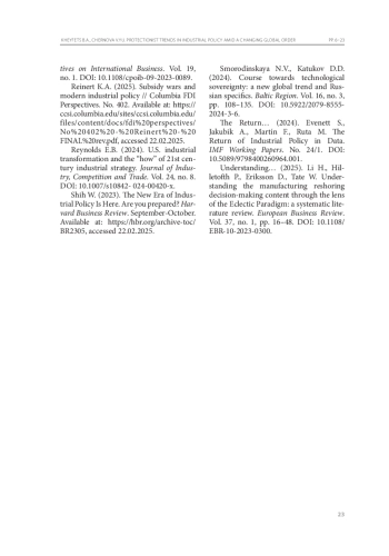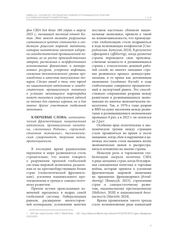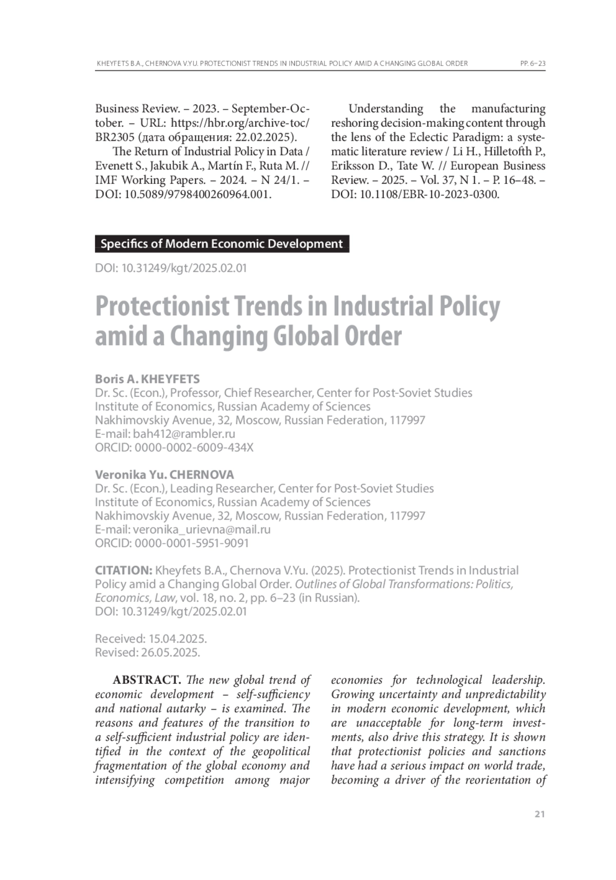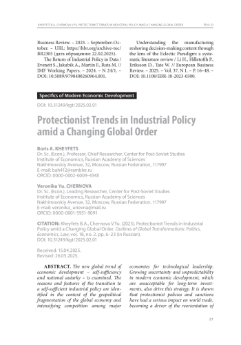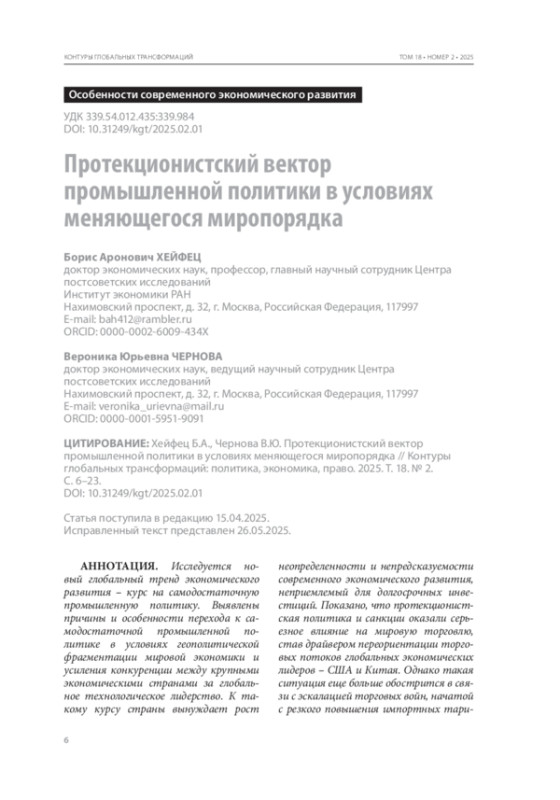 ХЕЙФЕЦ Б. А., ЧЕРНОВА В. Ю. ПРОТЕКЦИОНИСТСКИЙ ВЕКТОР ПРОМЫШЛЕННОЙ ПОЛИТИКИ В УСЛОВИЯХ МЕНЯЮЩЕГОСЯ МИРОПОРЯДКА // КОНТУРЫ ГЛОБАЛЬНЫХ ТРАНСФОРМАЦИЙ: ПОЛИТИКА, ЭКОНОМИКА, ПРАВО. 2025. ТОМ 18, №2