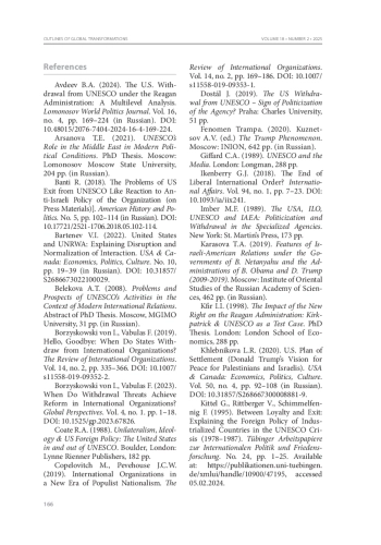 1. Авдеев Б.А. Выход США из ЮНЕСКО при администрации Р. Рейгана: многоуровневый анализ // Вестник Московского университета. Серия XXV. Международные отношения и мировая политика. - 2024. - Т. 16, № 4. - С. 169- 224. - https://doi.org/10.48015/2076-7404-2024-16-4-169-224.