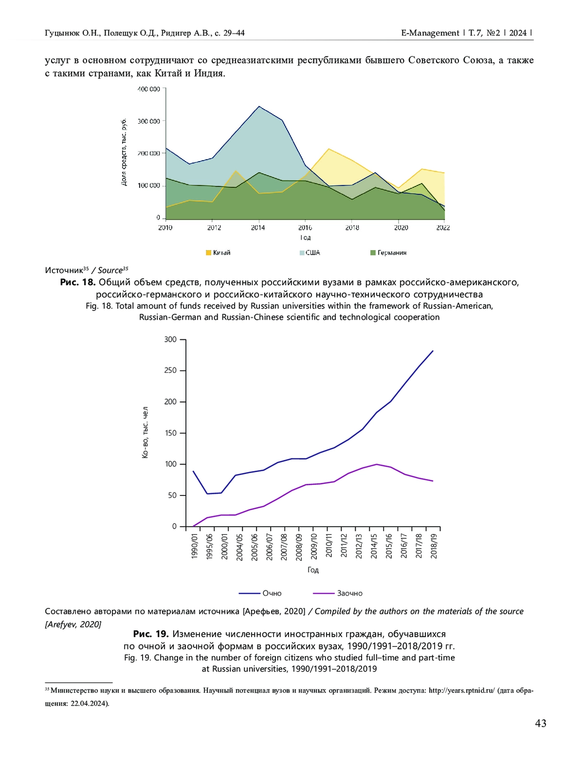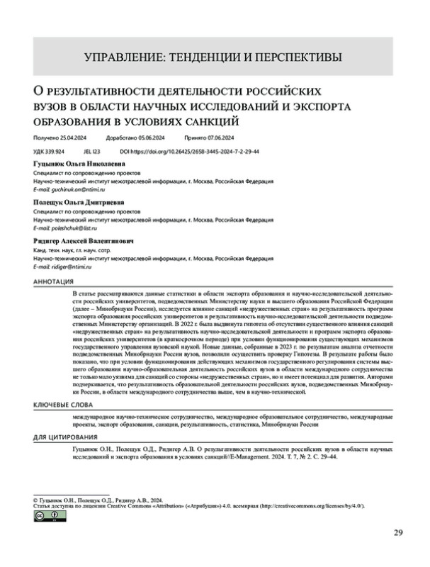 В статье рассматриваются данные статистики в области экспорта образования и научно-исследовательской деятельности российских университетов, подведомственных Министерству науки и высшего образования Российской Федерации (далее – Минобрнауки России), исследуется влияние санкций «недружественных стран» на результативность программ экспорта образования российских университетов и результативность научно-исследовательской деятельности подведомственных Министерству организаций. В 2022 г. была выдвинута гипотеза об отсутствии существенного влияния санкций «недружественных стран» на результативность научно-исследовательской деятельности и программ экспорта образования российских университетов (в краткосрочном периоде) при условии функционирования существующих механизмов государственного управления вузовской наукой. Новые данные, собранные в 2023 г. по результатам анализа отчетности подведомственных Минобрнауки России вузов, позволили осуществить проверку Гипотезы. В результате работы было показано, что при условии функционирования действующих механизмов государственного регулирования системы высшего образования научно-образовательная деятельность российских вузов в области международного сотрудничества не только мало уязвима для санкций со стороны «недружественных стран», но и имеет потенциал для развития. Авторами подчеркивается, что результативность образовательной деятельности российских вузов, подведомственных Минобрнауки России, в области международного сотрудничества выше, чем в научно-технической.