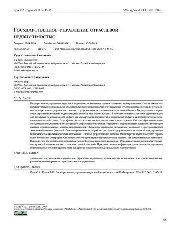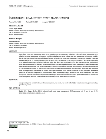 Государственное управление отраслевой недвижимостью является одним из сложных видов управления. Оно включает технологии управления отдельными объектами, технологии корпоративного управления с учетом интересов отрасли и технологии государственного управления с учетом государственных интересов и межотраслевого баланса. Государственное управление отраслевой вузовской недвижимостью является еще более сложным. В качестве основного критерия эффективности оно использует не коммерческий эффект, как коммерческие предприятия, а социальный эффект и критерий ресурсного обеспечения отраслей страны. Этот эффект считается по косвенным показателям, а не по прямым. Система образования является дотационной, поэтому прямая оценка ее эффективности условна. Управление недвижимостью вузовских организаций является одним из важных компонентов управления. Отраслевое управление недвижимостью связано с пространственной экономикой и геоинформатикой. Описана оригинальная разработка системы поддержки принятия решений для управления недвижимостью объектов системы образования. Система разработана по заданию Министерства науки и высшего образования Российской Федерации. Она использует географические информационные системы как дополнительный компонент. Показано, что для управления недвижимостью необходимо применять геоданные. Описаны основные принципы управлении вузовской недвижимостью с помощью данной системы. Пространственная информация для отраслевого управления недвижимостью объектов должна быть объединена с экологической, социальной и экономической.