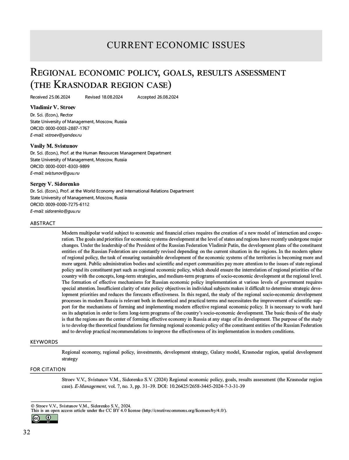 Современный многополярный мир, подверженный экономическим и финансовым кризисам, требует создания новой модели взаимодействия и сотрудничества. Цели и приоритеты развития экономических систем на уровне государств и регионов в последнее время претерпевают большие изменения. Под руководством Президента Российской Федерации (далее – РФ) В. В. Путина планы развития субъектов РФ постоянно пересматриваются в зависимости от сложившейся в регионе ситуации. В сфере современной региональной политики становится все более актуальной задача обеспечения устойчивого развития экономических систем территории. Органы государственного управления, научное и экспертное сообщества уделяют все большее внимание проблемам государственной региональной политики и ее составной части – региональной экономической политике, которая должна обеспечивать взаимосвязь региональных приоритетов страны с разрабатываемыми на уровне субъектов концепциями, долгосрочными стратегиями и среднесрочными программами социально-экономического развития. Формирование эффективных механизмов реализации экономической политики РФ на различных уровнях власти требует особого внимания. Недостаточная четкость целей государственной политики в отдельных субъектах затрудняет определение стратегических приоритетов развития и снижает эффективность прогнозов. В связи с этим исследование процессов регионального социально-экономического развития в современной России является актуальным как в теоретическом, так и практическом плане и обусловливает необходимость совершенствования научного обеспечения механизмов формирования и реализации современной эффективной региональной экономической политики. Требуется усиленная работа над ее адаптацией с целью формирования долгосрочных программ социально-экономического развития страны. Базисный тезис исследования заключается в том, что центром формирования эффективной экономики РФ на любом этапе ее развития являются регионы. Целью исследования выступают развитие теоретических основ формирования региональной экономической политики субъектов РФ и разработка практических рекомендаций по повышению эффективности ее реализации в современных условиях.