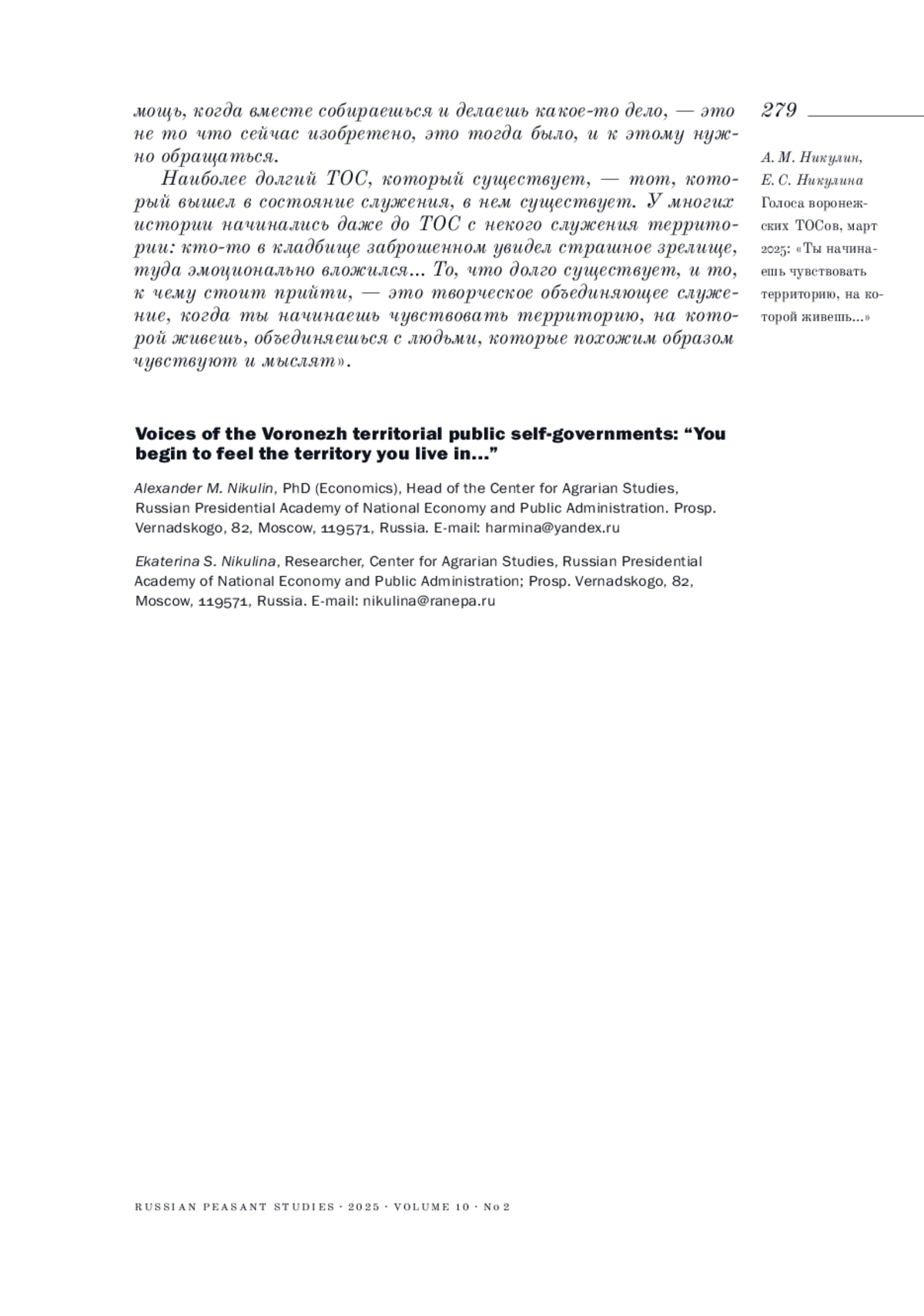 Воронежская область — одна из лидеров в развитии территориального общественного самоуправления России. За последние 10 лет в области создано более 2400 ТОСов, членами которых являются около полумиллиона жителей. В поддержку движения ТОСов в регионе действуют два грантооператора: АНО «Образ будущего» и Ассоциация «Совет муниципальных образований Воронежской области». В 2024 году создана Ассоциация ТОС и местных сообществ Воронежской области. Координирующую роль выполняет комитет Воронежской областной думы по местному самоуправлению и министерство внутренней политики. Данный системный опыт развития ТОС-движения является, безусловно, актуальным и перспективным общественным явлением, требующим еще своего внимательного научного изучения и осмысления