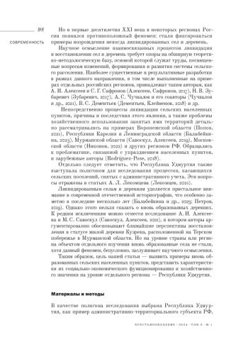 5. Лекомцев А. Л., Литвинов А. А. (2021). Сокращение числа сельских населенных пунктов: современные тенденции, факторы, формы (на примере Удмуртской Республики) // Материалы международной научной конференции (XII Ежегодная научная Ассамблея АРГО) “Настоящее и будущее России в меняющемся мире: общественно-географический анализ и прогноз”. С. 545-550. EDN: RFSTXS