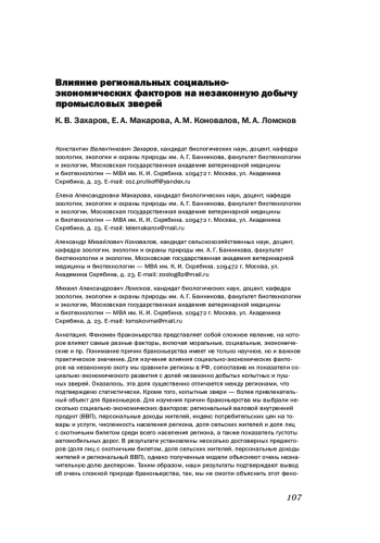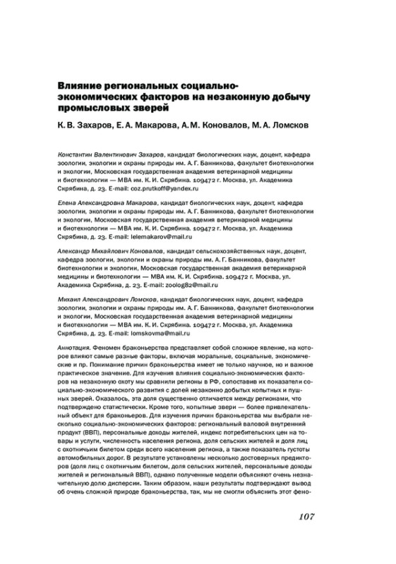 Феномен браконьерства представляет собой сложное явление, на которое влияют самые разные факторы, включая моральные, социальные, экономические и пр. Понимание причин браконьерства имеет не только научное, но и важное практическое значение. Для изучения влияния социально-экономических факторов на незаконную охоту мы сравнили регионы в РФ, сопоставив их показатели социально-экономического развития с долей незаконно добытых копытных и пушных зверей. Оказалось, эта доля существенно отличается между регионами, что подтверждено статистически. Кроме того, копытные звери - более привлекательный объект для браконьеров. Для изучения причин браконьерства мы выбрали несколько социально-экономических факторов: региональный валовой внутренний продукт (ВВП), персональные доходы жителей, индекс потребительских цен на товары и услуги, численность населения региона, доля сельских жителей и доля лиц с охотничьим билетом среди всего населения региона, а также показатель густоты автомобильных дорог. В результате установлены несколько достоверных предикторов (доля лиц с охотничьим билетом, доля сельских жителей, персональные доходы жителей и региональный ВВП), однако полученные модели объясняют очень незначительную долю дисперсии. Таким образом, наши результаты подтверждают вывод об очень сложной природе браконьерства, так, мы не смогли объяснить этот феномен через набор нескольких, казалось бы, очевидных переменных, как это сделано для некоторых других стран.