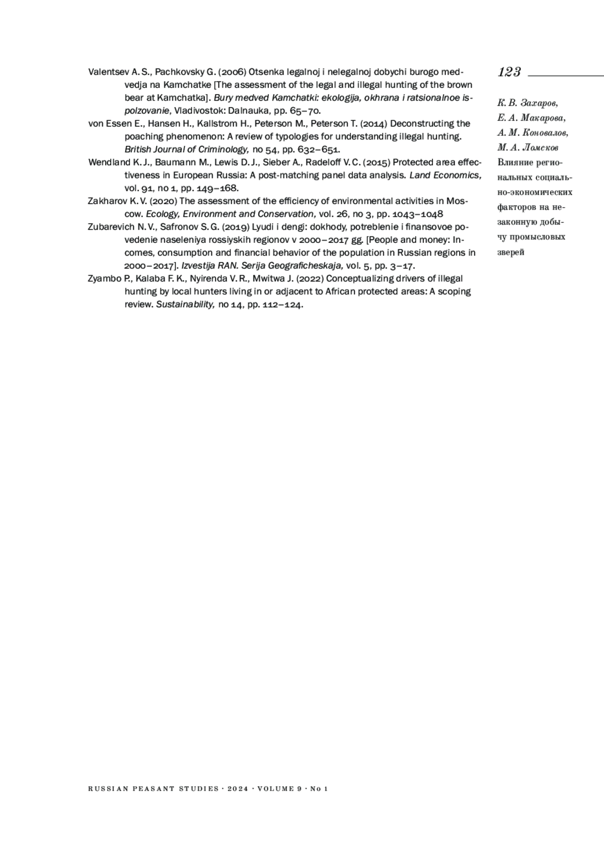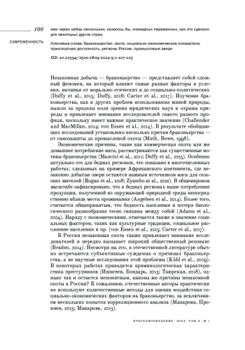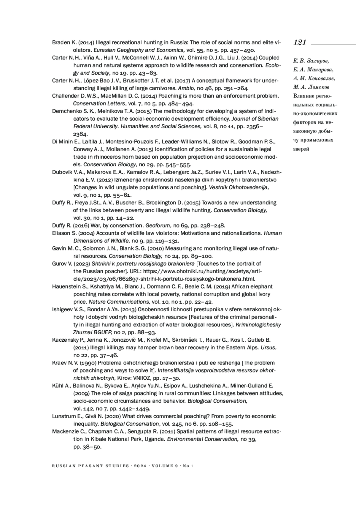 21. Braden K. (2014). Illegal recreational hunting in Russia: the role of social norms and elite violators // Eurasian Geography and Economics. Vol. 55. № 5. P. 457-490. EDN: UPKOFZ