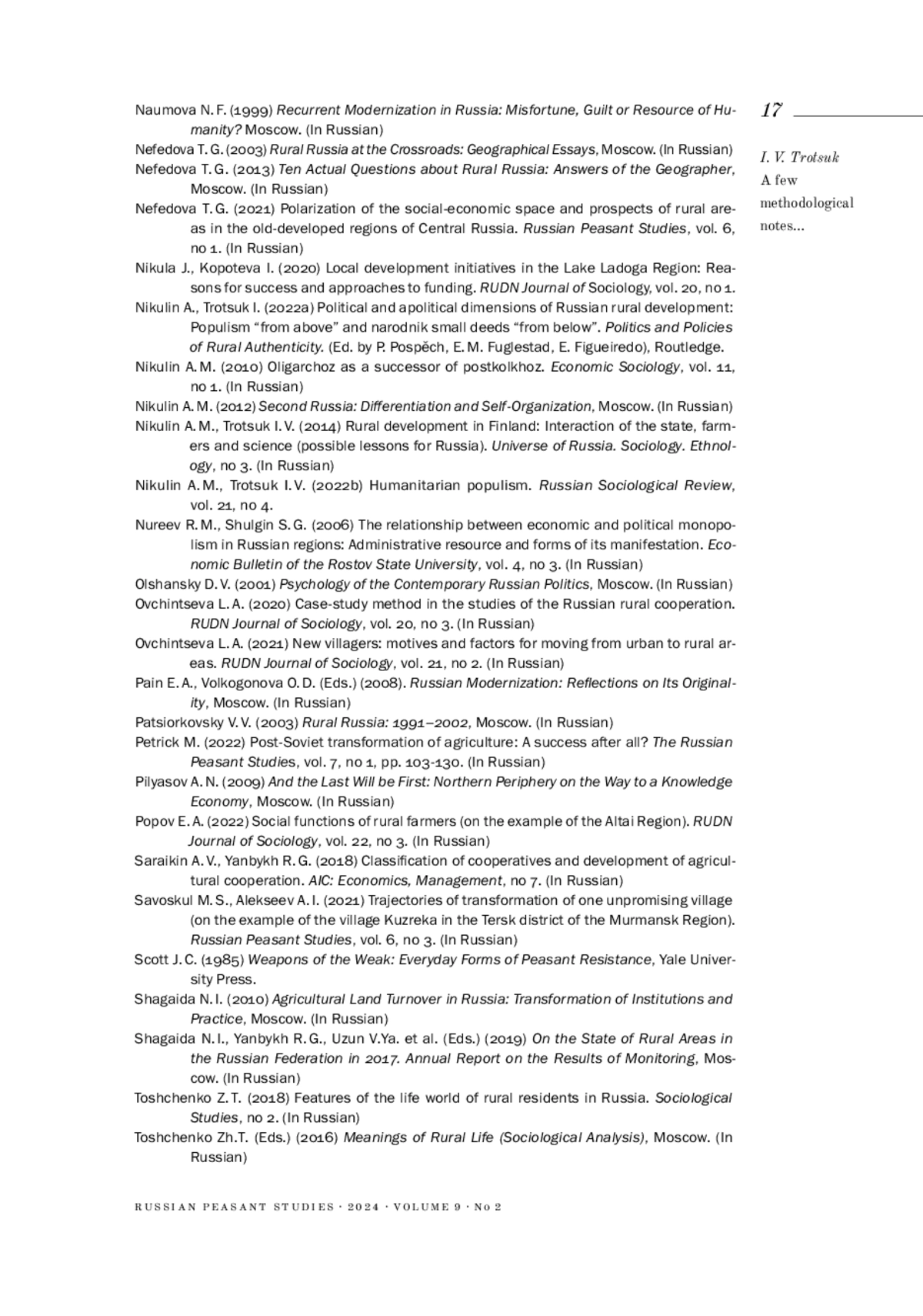 61. Trotsuk I. V. (2019b) Similarities and differences between two sociological discourses about rural Russia. Scientific Notes of the Crimean Federal University named after V. I. Vernadsky. Sociology. Pedagogy. Psychology, no 2. (In Russian).