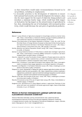 5. Kisly O. A., Isaeva M. A. (2023) The situation of labor migrants in Russian agriculture under the pandemic. URL: https://cyberleninka.ru/article/n/polozhenie-trudovyh-migrantov-v-period-pandemii-v-selskom-hozyaystve-rossii/viewer. (In Russian).
