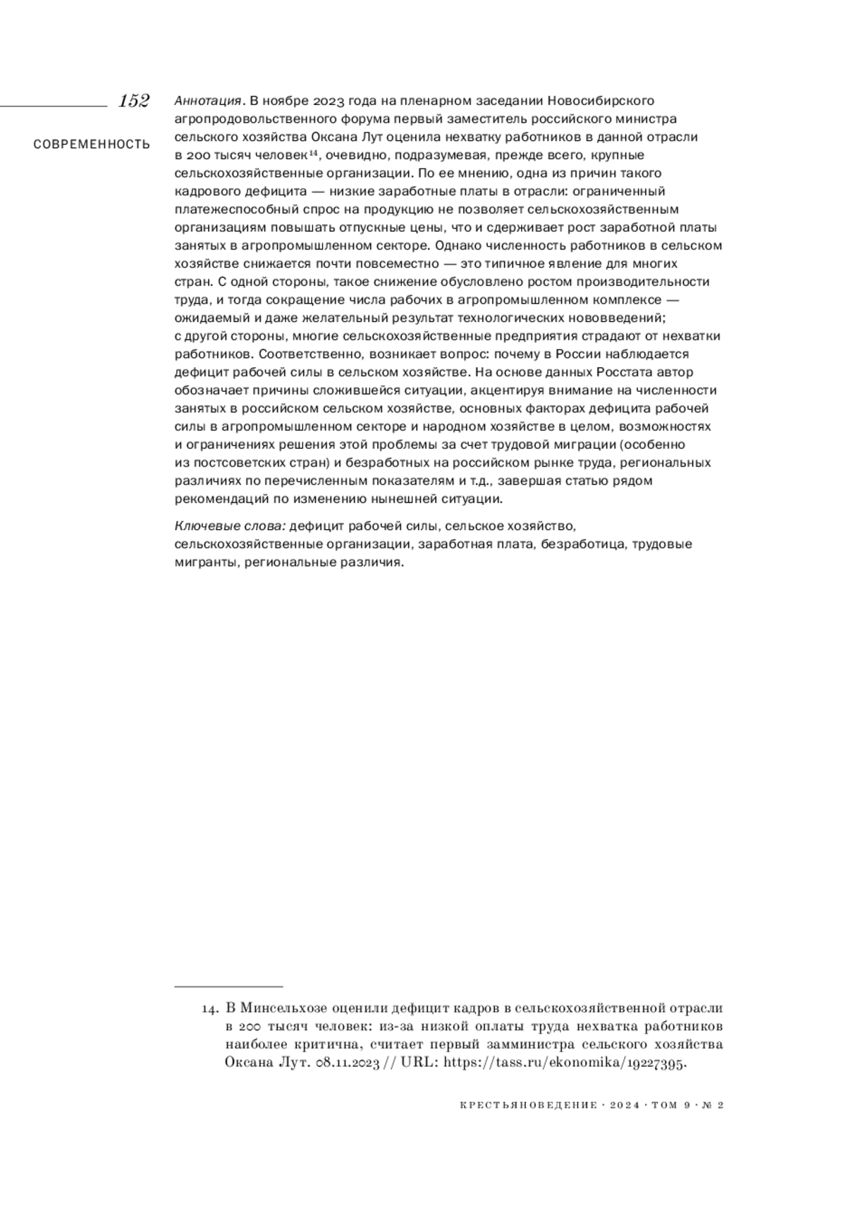 In November 2023, the First Deputy Minister of Agriculture Oksana Lut estimated the shortage of workers in agriculture at 200,0001, obviously implying agricultural organizations. According to Lut, one of the reasons for such a shortage is low salaries: the limited effective demand for products does not allow agricultural organizations to increase the selling price of produce, which limits the wages of agricultural workers. However, the number of people employed in agriculture declines almost everywhere - this is a common situation in many countries. On the one hand, this decline is determined by an increase in labor productivity, i. e., a reduction in the number of workers is the desired result; on the other hand, many agricultural enterprises suffer from the lack of needed workers. Therefore, it is necessary to understand why there is a shortage of agricultural workers in Russia, focusing on the details of this situation. Based on the Federal State Statistics Service’s data, the author considers this situation, in particular the number of employed in agriculture, main reasons for such a labor shortage in agriculture and national economy in general, possibilities and limitations of the reliance/ dependence on labor migrants (especially from the post-Soviet countries) and on unemployed in the Russian labor market, regional differences in the available workforce, finally providing some recommendations to change the current situation.