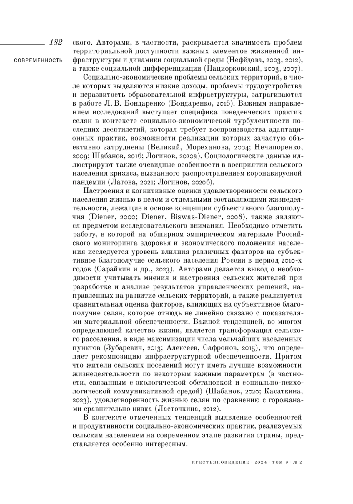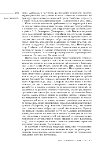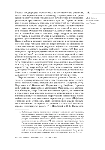 Россия неоднородна: территориально-поселенческие различия, вследствие неравномерности инфраструктурного развития, традиционно являются крайне значимыми с точки зрения возможностей реализации продуктивных жизненных практик. Первая половина 2020-х годов оказалась периодом многоаспектной нестабильности, последствия которой ощутимы для всех социально-демографических групп населения, но проявляются для каждой из них в разной степени. Особенности жизнедеятельности россиян, проживающих в сельской местности, очевидно, актуализируют рассмотрение этой группы в качестве объекта исследования. Насколько высок уровень субъективного благополучия сельского населения страны? Какие проблемы являются наиболее значимыми и воспринимаются особенно остро? В какой степени потребительские возможности селян ограничены вследствие ресурсного дефицита и, напротив, расширяются в контексте развития цифровых технологий?