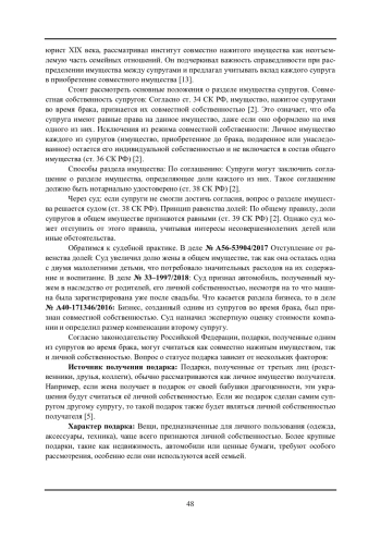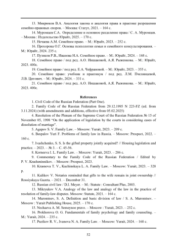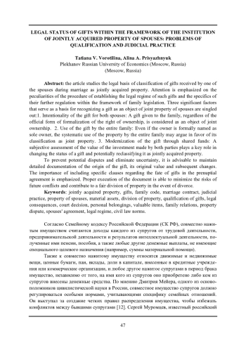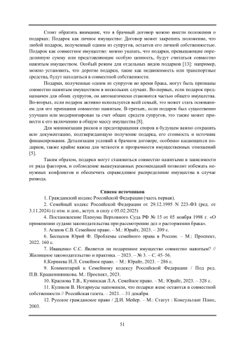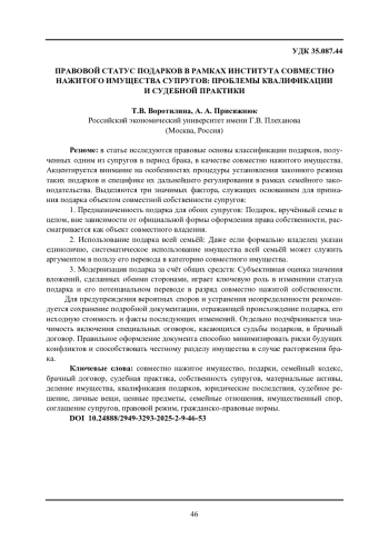 ВОРОТИЛИНА Т. В., ПРИСЯЖНЮК А.А. ПРАВОВОЙ СТАТУС ПОДАРКОВ В РАМКАХ ИНСТИТУТА СОВМЕСТНО НАЖИТОГО ИМУЩЕСТВА СУПРУГОВ: ПРОБЛЕМЫ КВАЛИФИКАЦИИ И СУДЕБНОЙ ПРАКТИКИ // ВОПРОСЫ ГОСУДАРСТВА И ПРАВА. 2025. № 2 (9)