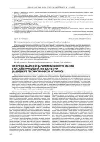 В данной статье рассматриваются особенности толкования понятия красоты в русском и французском языках, отражающие динамику семантических изменений ключевых лексем красота и beaute. В результате анализа русских и французских лексикографических источников разных хронологических периодов прослеживается расширение и усложнение понятия «красота», выделяются конкретные объекты и явления, выступающие в качестве эталонов для объективации данного понятия. Устанавливается следующая закономерность: в ранних источниках понятие красоты как в русском, так и во французском языках соотносилось преимущественно с физической красотой и гармонией, в последующие периоды оно становится отражением и внутреннего (нравственного и духовного) совершенства. Определено, что в русской лингвокультуре, по сравнению с французской, красота представляет собой комплексное и многослойное понятие, сочетающее внешние и внутренние качества. Сделан вывод о трансформации понятия на разных этапах его исторического развития. Отмечено, что отдельные признаки понятия красоты в обеих лингвокультурах уходят в прошлое, появляются новые, обусловленные историческими, социально-культурными изменениями, ролью идеалов и символов в конкретной культуре.