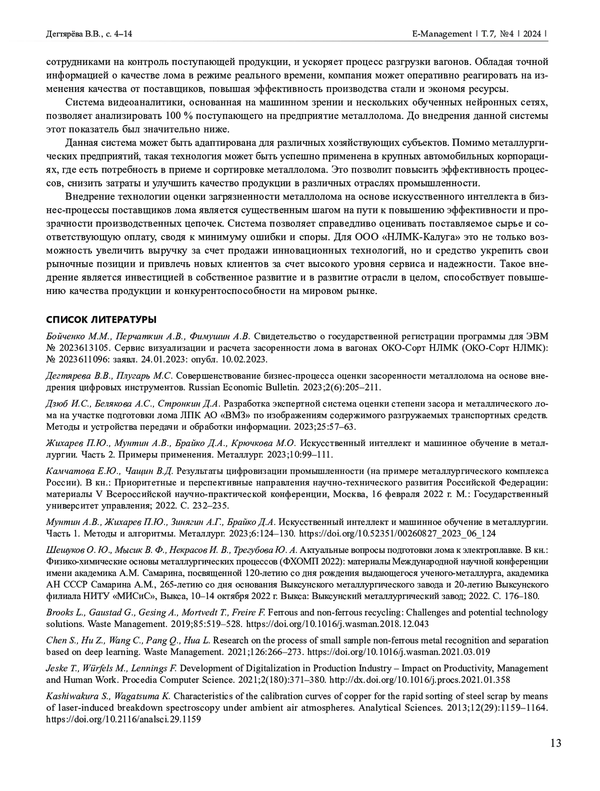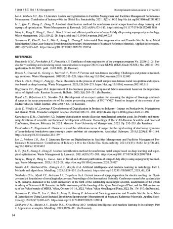 2. Дегтярева В.В., Плугарь М.С. Совершенствование бизнес-процесса оценки засоренности металлолома на основе вне дрения цифровых инструментов. Russian Economic Bulletin. 2023;2(6):205-211.