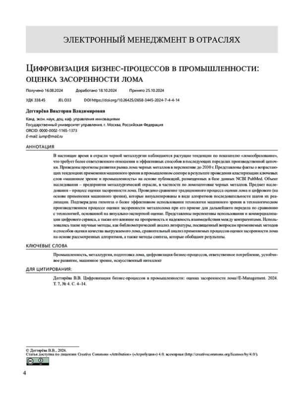 В настоящее время в отрасли черной металлургии наблюдаются растущие тенденции по показателю «ломообразование», что требует более ответственного отношения и эффективных способов в последующих переделах производственной цепочки. Приведены прогнозы развития рынка лома черных металлов в перспективе до 2030 г. Представлены факты о возрастающих тенденциях применения машинного зрения в промышленном секторе в результате проведения кластеризации ключевых слов «машинное зрение и промышленность» на основе публикаций, размещенных в базе данных NCBI PubMed. Объект исследования – предприятия металлургической отрасли, в частности по ломозаготовке черных металлов. Предмет исследования – процесс оценки засоренности лома. Проведено сравнение традиционного процесса оценки лома и цифрового (на основе применения машинного зрения), которые визуализированы в виде алгоритмов последовательности шагов их реализации. Подтверждена гипотеза о более эффективном использовании технологии машинного зрения в технологическом производственном процессе оценки засоренности металлолома при его приеме для дальнейшего передела по сравнению с технологией, основанной на визуально-экспертной оценке. Представлены перспективы использования и коммерциализации цифрового сервиса, а также его влияние на прозрачность и надежность взаимодействия между контрагентами. Использовались такие научные методы, как библиометрический анализ литературы, посвященный вопросам применяемых методов и способов оценки качества выгружаемого лома, сравнительный анализ применяемых процессов оценки засоренности лома на основе рассмотренных алгоритмов, а также методы синтеза, которые обобщают результаты.