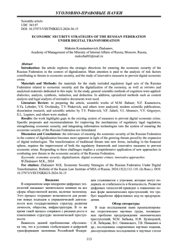 Введение: в статье исследуются стратегические направления обеспечения экономической безопасности Российской Федерации в условиях цифровизации. Основное внимание уделяется анализу риск-факторов, способствующих угрозам экономической безопасности, и изучению инновационных мер предупреждения цифровой экономической преступности.