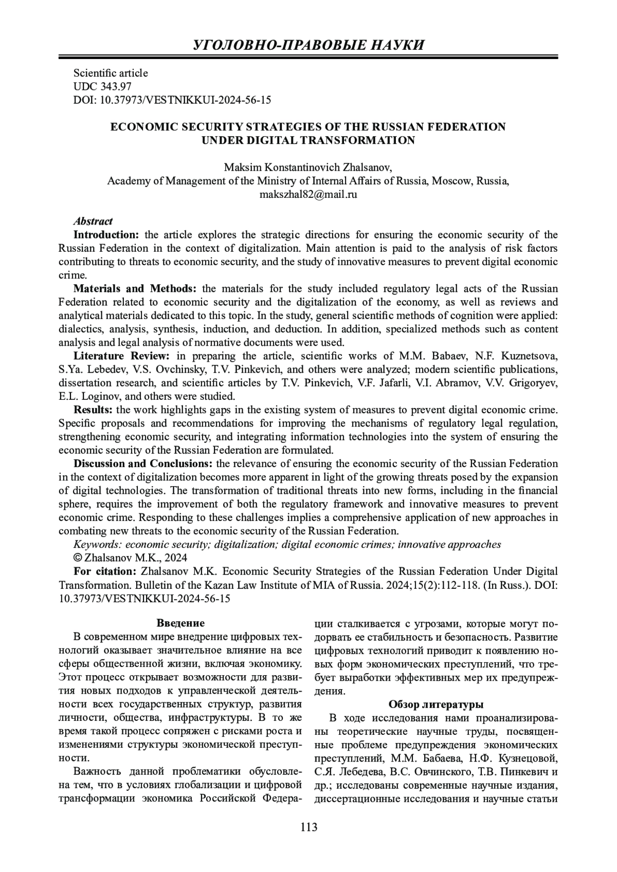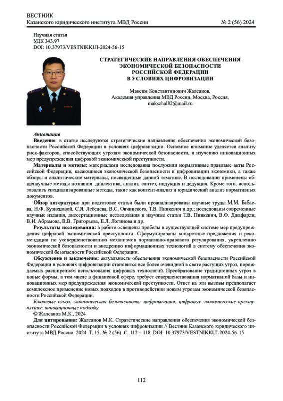 ЖАЛСАНОВ М. К. СТРАТЕГИЧЕСКИЕ НАПРАВЛЕНИЯ ОБЕСПЕЧЕНИЯ ЭКОНОМИЧЕСКОЙ БЕЗОПАСНОСТИ РОССИЙСКОЙ ФЕДЕРАЦИИ В УСЛОВИЯХ ЦИФРОВИЗАЦИИ // ВЕСТНИК КАЗАНСКОГО ЮРИДИЧЕСКОГО ИНСТИТУТА МВД РОССИИ. 2024. Т. 15 № 2 (56)