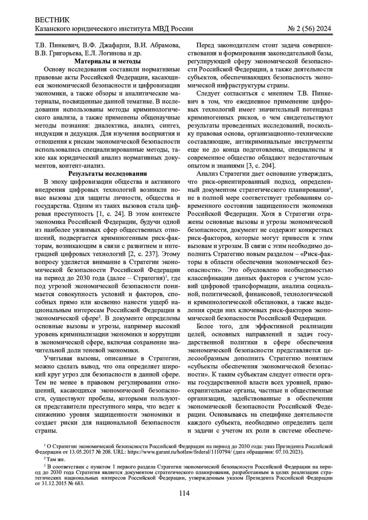 Материалы и методы: материалами исследования послужили нормативные правовые акты Российской Федерации, касающиеся экономической безопасности и цифровизации экономики, а также обзоры и аналитические материалы, посвященные данной тематике. В исследовании применены общенаучные методы познания: диалектика, анализ, синтез, индукция и дедукция. Кроме того, использовались специализированные методы, такие как контент-анализ и юридический анализ нормативных документов.