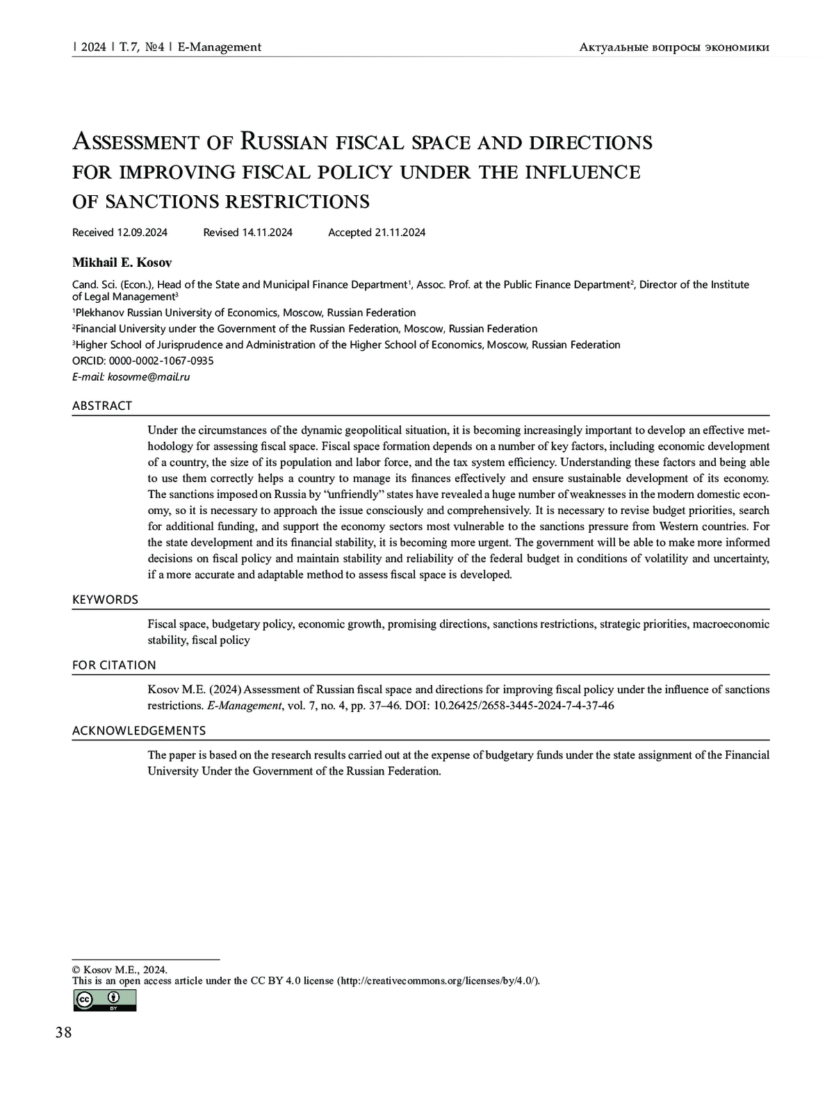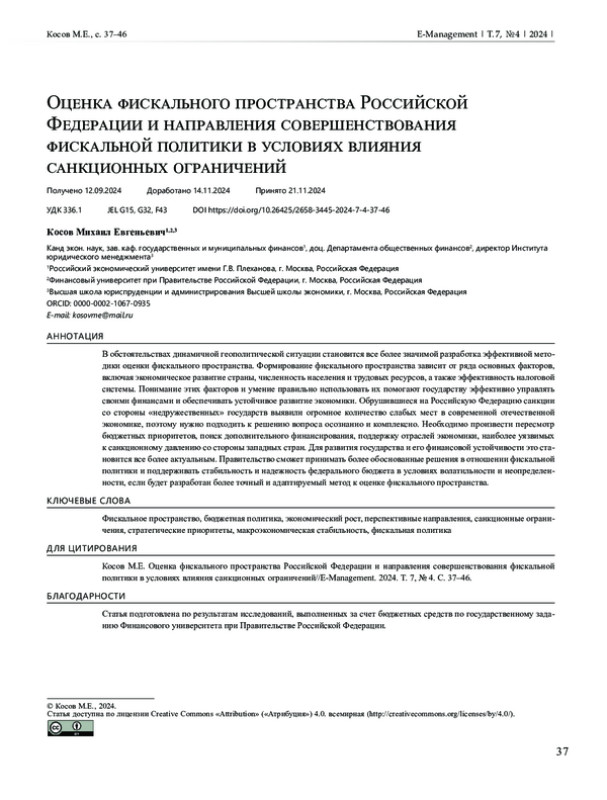 В обстоятельствах динамичной геополитической ситуации становится все более значимой разработка эффективной методики оценки фискального пространства. Формирование фискального пространства зависит от ряда основных факторов, включая экономическое развитие страны, численность населения и трудовых ресурсов, а также эффективность налоговой системы. Понимание этих факторов и умение правильно использовать их помогают государству эффективно управлять своими финансами и обеспечивать устойчивое развитие экономики. Обрушившиеся на Российскую Федерацию санкции со стороны «недружественных» государств выявили огромное количество слабых мест в современной отечественной экономике, поэтому нужно подходить к решению вопроса осознанно и комплексно. Необходимо произвести пересмотр бюджетных приоритетов, поиск дополнительного финансирования, поддержку отраслей экономики, наиболее уязвимых к санкционному давлению со стороны западных стран. Для развития государства и его финансовой устойчивости это становится все более актуальным. Правительство сможет принимать более обоснованные решения в отношении фискальной политики и поддерживать стабильность и надежность федерального бюджета в условиях волатильности и неопределенности, если будет разработан более точный и адаптируемый метод к оценке фискального пространства.