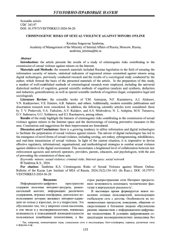 Результаты исследования: выделены особенности криминогенных рисков, способствующих совершению сексуального насилия над несовершеннолетними в интернет-пространстве, и недостатки существующих превентивных мер в данной области, сформулированы выводы и предложения по их совершенствованию.